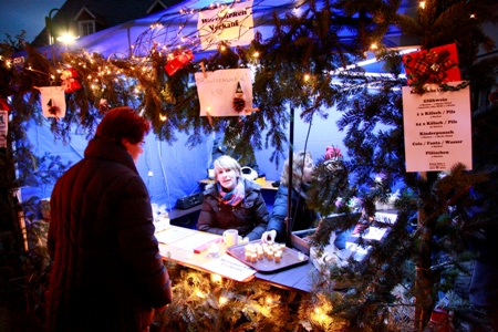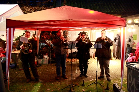 Anschließend spielten die Meinhardus-Musikanten aus Meinerzhagen auf ihren Blasinstrumenten die schönsten Weihnachtslieder und versetzten Publikum und Szenerie bei Kerzenlichterschein in vorweihnachtliche Stimmung. Wem dabei nach Glühwein und Grog zumute war, der konnte sich am Getränkewagen des Schützenhofs von Mike Hinze bestens bedienen lassen. Aber auch für die Liebhaber erfrischender Kaltgetränke wurde angesichts der milden Temperaturen bestens gesorgt und wer seinen Hunger stillen wollte, konnte dies durch mancherlei herzhafte oder süße Speisen tun. Sogar Popcorn wurde live am Stand des Fördervereins der Gemeinschaftsgrundschule zubereitet.