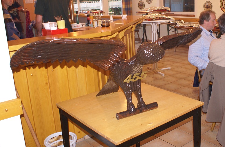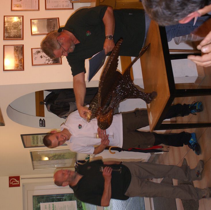 Es folgte das Highlight des Abends: Die Vogeltaufe! Ein prächtiger, in dunklem Braun gestalteter Greif aus Pappelholz stand in der Mitte des Raumes. Ausgestattet mit einer Spannweite von 142 cm, einem Rumpf von 92 cm und einem Gewicht von fast 12 kg blickte er herrschaftlich auf das Schützenvolk. Der 1. Vorsitzende, Reiner Schenk, näherte sich ihm vorsichtig und wurde von der Vogelbaukommission Felix Niehaus, Reiner Haffke und Gert Hevendehl begleitet. Nach einem biologischen Exkurs zur Namensfindung wurde das Geheimnis gelüftet: Unser diesjähriger Vogel erhält den Namen Sperber vom Remshagen. Mit dem obligatorischen Müllenbacher Schützenmarsch wurde die Sitzung geschlossen.
