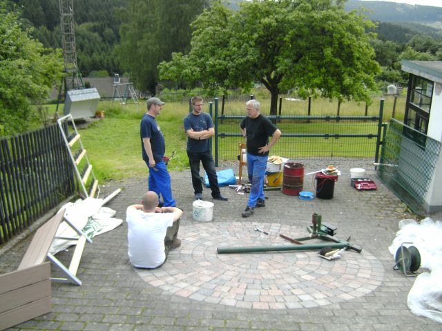 Es herrschte reges Treiben rund um die Schützenhalle. König Mike I. hatte seine Hofherren zum Arbeitsdienst an der Schützenhalle zusammen getrommelt. Nachdem sie bereits vor zwei Wochen in strömenden Regen die Hecke rund um den Vorplatz der Schützenhalle geschnitten hatten, war ihnen der Wettergott heute gnädig. Sie installierten oberhalb des Schießhauses zum Vogelschießen einen Zaun – natürlich in schützenfestgrün- und strichen die Stützwand unterhalb des Zaunes.