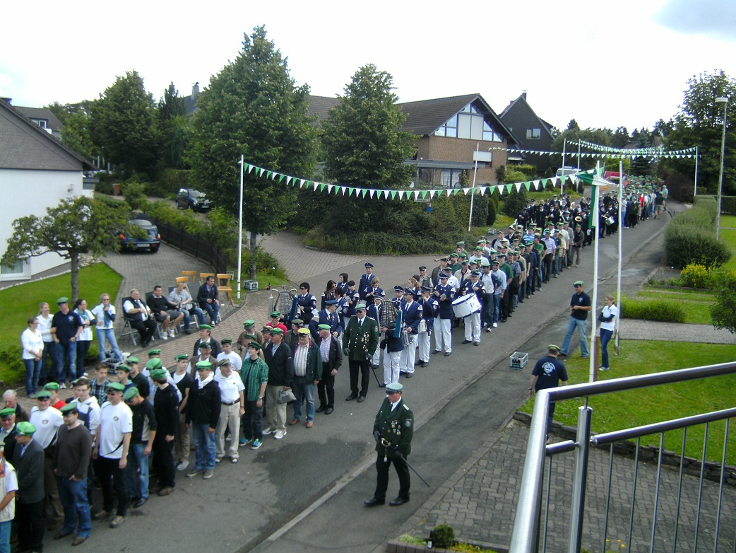 Bereits am Morgen war der Wettergott den Müllenbacher Schützen hold und bei leicht bewölktem Himmel traten über 325 Schützen an, um König Mike I. aus dem Hause Hinze an seiner Residenz auf der Vogelruthe abzuholen. Musikalisch begleitet wurde der Schützenzug vom Musikverein Hoffnung Hünsborn, dem Musikzug der Freiwilligen Feuerwehr Marienheide und dem Tambourcorps Einigkeit aus Werdohl.