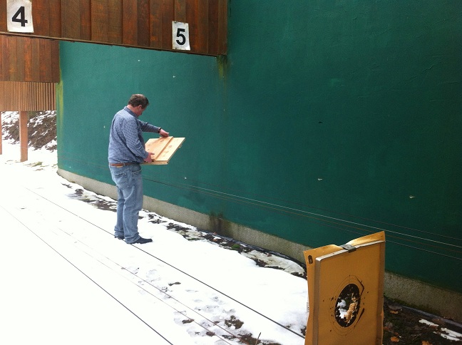 Die derzeit noch verputzten Seitenblenden der Kleikaliber-Schießbahn am Schießstand Am Brecher werden mit einsetzendem Frühlingswetter mit einer Lerchenholzschalung versehen. Wind und Wetter haben dem Putz in den letzten Jahren stark zugesetzt. Durch die entstandenen Risse dringt Feuchtigkeit in das Mauerwerk ein und schadet mittelfristig der Bausubstanz. Zimmermann und Schützenbruder Stefan Hochsattel präsentierte beim Trainingsschießen im März eine Holzverschalung, die von Schießkommission und Vorstand hinsichtlich der Tauglichkeit kritisch untersucht wurde. Wichtig ist sicherzustellen, dass die Verschalung bei einem irrtümlichen Beschuss keine Querschläger zulässt und das Geschoss im Holz steckenbleibt. Das Ergebnis des durchgeführten Praxistests entsprach den Anforderungen, so dass für die Montage grünes Licht gegeben werden konnte. Jetzt warten alle auf Frühlingswetter, um mit den zeit- und materialaufwendigen Arbeiten beginnen zu können.