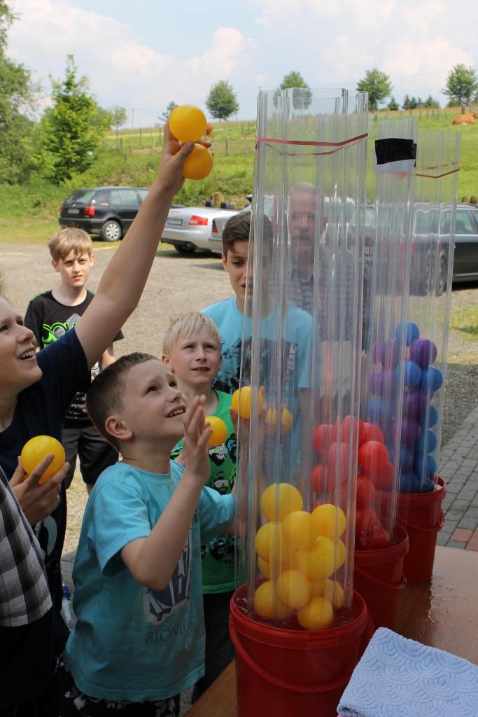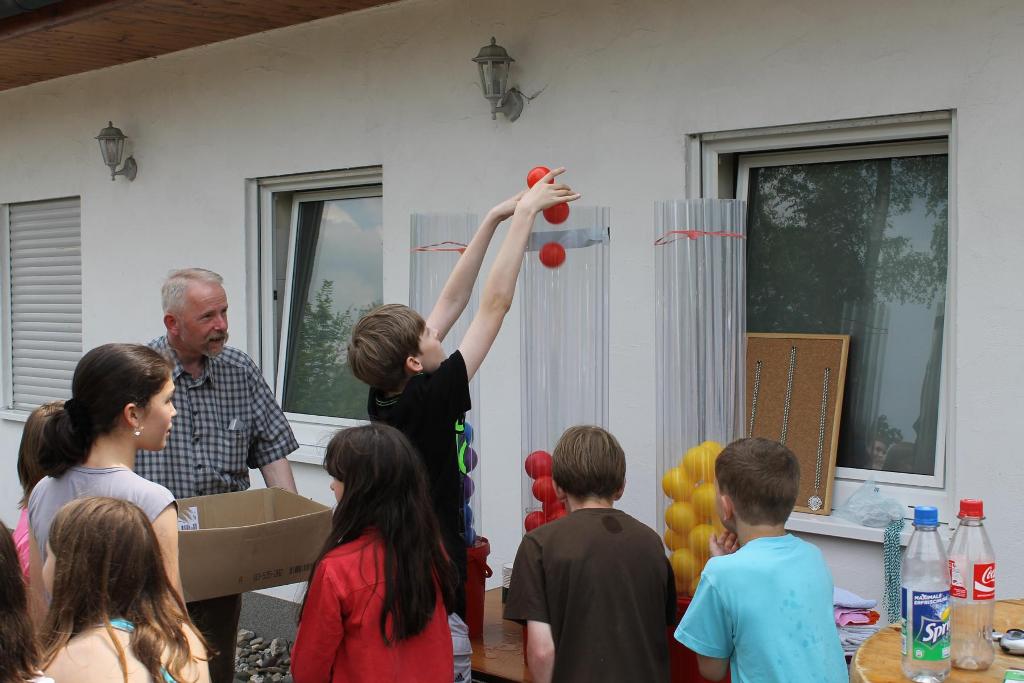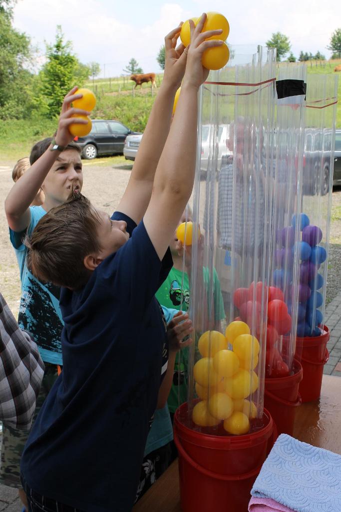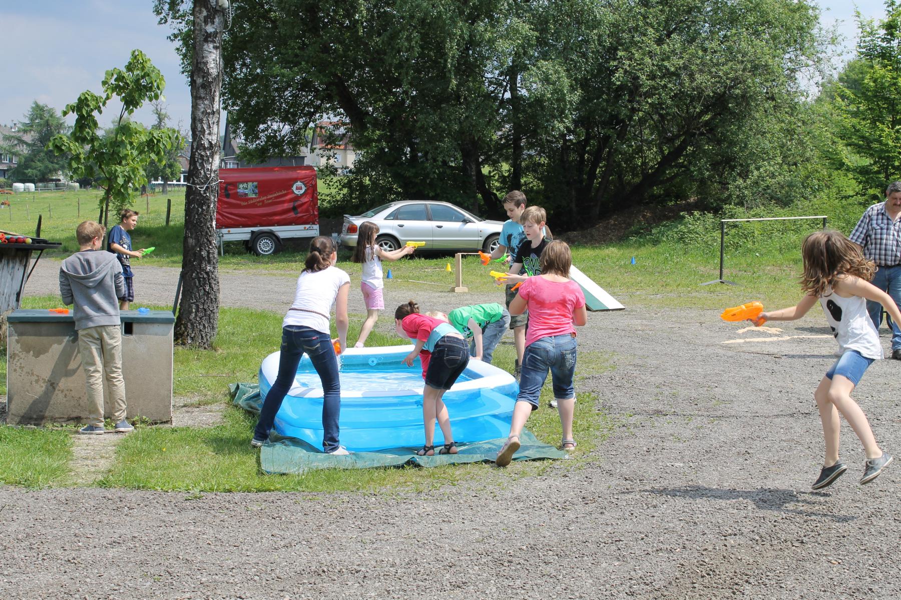 Mit ausgelassener und guter Stimmung fand am Samstag, den 08.06.2013 das diesjährige Kinderhoffest rund um den Schießstand „Am Brecher“ statt. Das gute und warme Wetter hat zum Gelingen des Nachmittages beigetragen. 13 Jungen und Mädchen waren der Einladung der Kinderfestkommission rund um Kommissionsleiter Andreas Kühnel gefolgt und lieferten sich gleich zu Beginn eine heftige Wasserschlacht. Die zahlreichen Wasserpistolen wurden am vorbereiteten Pool geladen und dann hieß es nur noch: „Jeder gegen Jeden!“. Nach der ersten Erfrischungen konnten und mussten die Kinder dann ihre Geschicklichkeit unter Beweis stellen. In drei Gruppen aufgeteilt galt es, u.a. zu Balancieren, die Kräfte beim Tauziehen zu messen oder die Treffsicherheit beim Dosenwerfen und Luftgewehrschießen umzusetzen. In den Pausen wurde die Wii-Station im Schießstand ausgiebig genutzt. Als Belohnung für die anstrengenden Spiele gab es von König Udo Herrmann nach den Wettkämpfen eine Extraportion Eis, die von allen Beteiligten dankbar angenommen und vernichtet wurde. Zum Abschluss wurde noch ein bunter Vitamin-Cocktail an alle verteilt. Axel Rauin hatte im Auftrag des Schützenvereins farbenfrohe Obstschalen zusammengestellt. Fazit: Eine rundum gelungene Veranstaltung für den Nachwuchs unseres Schützenvereines. Vielen Dank an alle Beteiligten!