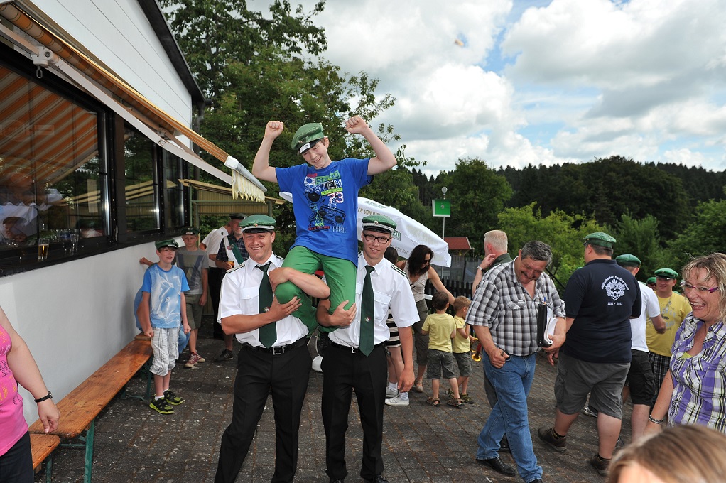 Auch in diesem Jahr stand der Schützenfestmontag im Zeichen der Familien und der Kinder. Am Vormittag traten ab 10.30 Uhr 8 Jungen an, um den Kindervogel von der Stange zu holen. Dabei stieg die Spannung nicht allein bei den jungen Schützen. Eltern und Großeltern fieberten mit und versuchten mit fachmännischem Rat ihre Favoriten zu unterstützen. Relativ schnell schoss Laurin Schenk den rechten Flügel ab. Der verbleibende Rest wurde dann um 11.33 Uhr mit dem 124. Schuss von Marvin Müller aus Müllenbach zu Fall gebracht. Auf den Schultern von zwei Offizieren wurde der neue König in die sehr besuchte Schützenhalle getragen. Die Freude war groß und schnell scharten sich die Jungen und Mädchen um den neuen Regenten. Im Kinderhof mit zu marschieren ist fast so gut wie selber König zu sein.