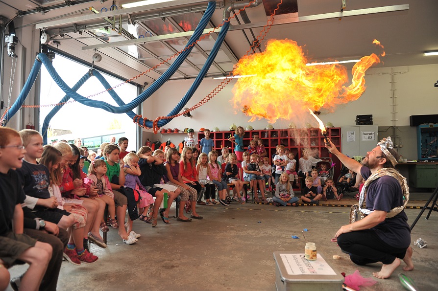 In der Zwischenzeit hatten die Offiziere während des Familienfrühschoppens 877,- € für das am Nachmittag stattfindende Kinderfest gesammelt. Bei der sich anschließenden Tombola konnten sich Käthe Viebahn und Sigrid L’hoest über die Hauptpreise freuen: jeweils ein Oberberg-Rundflug in einem Segelflugzeug. Um 14.00 Uhr bot der Zauberkünstler Springfloh in der Wagenhalle des Feuerwehrhauses seine Künste dar und verblüffte dabei Alt und Jung. Mit dem Schützenzug gingen die Kleinen dann zur Schützenhalle, um hier ihre Überraschungstüte in Empfang zu nehmen. Im Gegensatz zu den letzten Jahren war der Nachmittag warm und trocken, einen ordentlichen Regenschauer mit der gewünschten Abkühlung hatte pünktlich zur Mittagszeit gegeben.