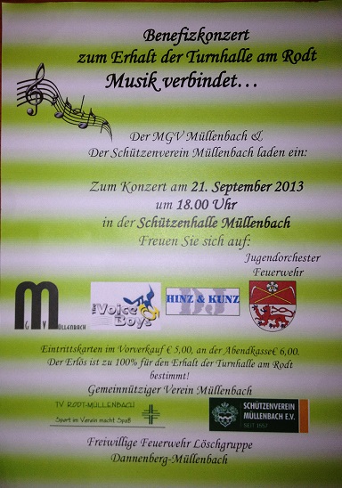 Der Erlös der Veranstaltung geht an den Turnverein Rodt/Müllenbach, der die Turnhalle in Rodt von der Gemeinde Marienheide übernehmen und in Eigenregie sanieren und betreiben will. Um Unterstützung bei dieser Herkulesaufgabe zu leisten, hatten sich die Müllenbacher Vereine entschlossen eine Benefizveranstaltung durchzuführen.