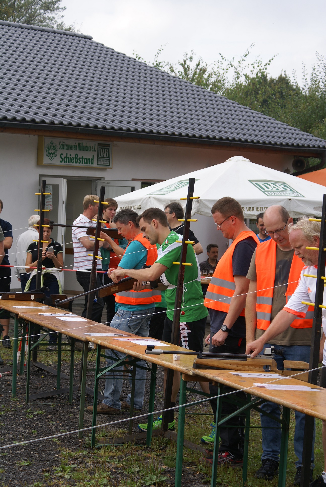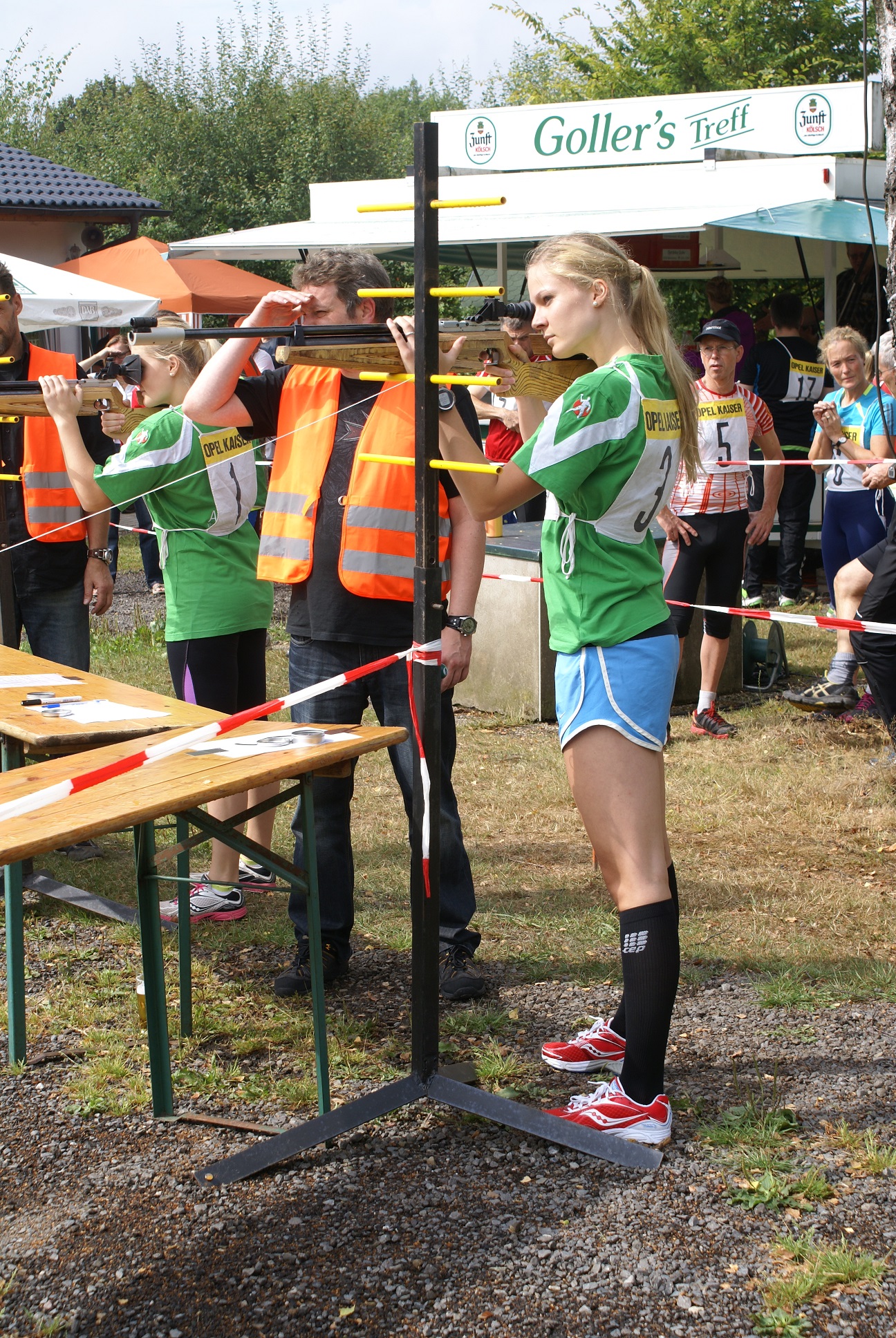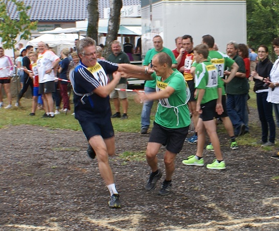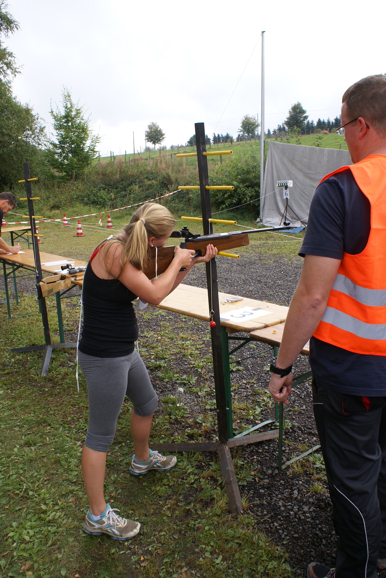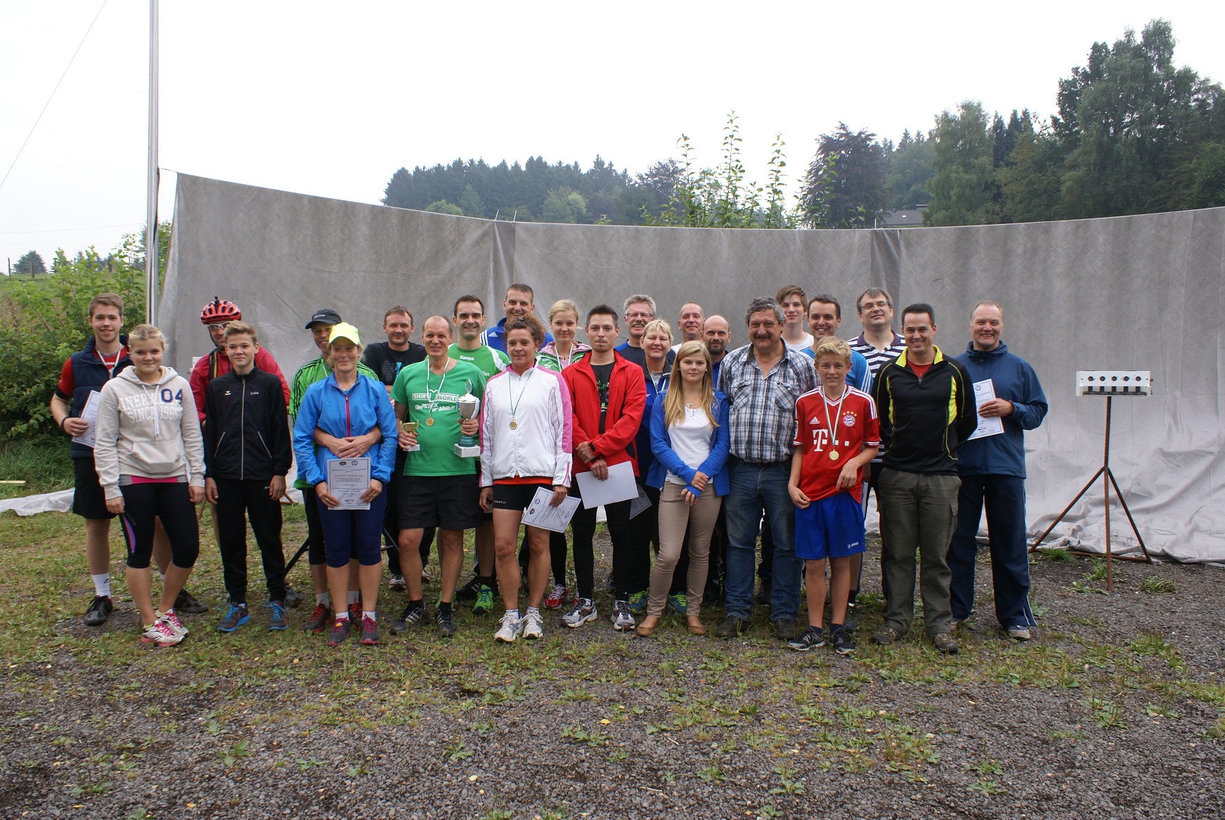 Valeri Schneider aus Müllenbach setzte sich beim 5. Müllenbacher-Biathlon am Samstag mit 13:32 Minuten gegen seine 34 Mittwettbewerber als Gesamtsieger durch. Damit war er 11 Sekunden schneller als im Vorjahr, als er dritter in der Gesamtwertung wurde. Norbert Wolf blieb 4 Sekunden und Thomas Pack 21 Sekunden hinter dem Erstplatzierten. Thomas Pack war im letzten Jahr 21 Sekunden schneller gewesen und belegte damals den zweiten Platz. Der letztjährige Sieger, Sebastian Viebahn, konnte in diesem Jahr aus beruflichen Gründen nicht starten. Die Damen mussten sich in der Rangliste an Katharina Vieweg (15:34 Minuten) messen. Platz 2 teilten sich Ann-Cathrin Viebahn und Claudia Manig. Platz 3 der Gesamtwertung belegte Johanna Vieweg. Die Damen waren überwiegend erstmalig beim Müllenbacher Sommer-Biathlon. Leider nahm keine der Wettkämpferinnen aus 2012 teil. Am Vormittag hatten der Schützenverein Müllenbach und der TV Rodt-Müllenbach noch Sorgen die Veranstaltung auf Grund des einsetzenden oberbergischen Regens absagen zu müssen. Doch gegen Mittag zeigte sich wieder die Sonne und der Wettkampf konnte planmäßig beginnen. Dreimal 800 m galt es für die Athleten zu laufen und zweimal mit dem Luftgewehr nach der ersten und zweiten Runde stehend aufgelegt 5 Scheibenspiegel zu treffen. Ein Fehlschuss hatte eine 40 m lange Strafrunde zur Folge. Die 100 Zuschauer konnten die Schießbahnen und die „Strafrunde“ bestens einsehen und die Sportler anfeuern. Die Veranstalter hatten für ausreichend Kaltgetränke, Kaffee und Kuchen und herzhaftes vom Grill gesorgt. Im zweiten Teil des Wettkampfs traten 5 Staffeln mit je 3 Läufern an. „Maschine Müllenbach“ mit den Läufern Valeri Schneider, Jürgen Schenk und Sebastian Kind siegte mit 19:10 Minuten und ließ „Die Erschrecker“ (Laurin Schenk, Dirk Schenk, Oliver Becker) mit 21:21 Minuten, „Aktivraum 2“ (Timo Montag, Sebastian Büder, Luis Vieweg) mit 21:35 Minuten, „Laktatexpress“ (Hans-Dieter Schlichting, Patrick Schäfer, Norbert Wolf) mit 21:36 Minuten und Aktivraum 1 (Johanna Vieweg, Katharina Vieweg, Luis Vieweg) mit 22:14 Minuten hinter sich. Sehr schönen Szenen gab es beim jeweiligen Läuferwechsel in der Staffel. Obwohl alle Staffelläufer vorher bereits in der Einzelwertung gestartet waren, gaben sie für ihre Mannschaft nochmal alles. Nach der Siegerehrung freuten sich die Verantwortlichen über den reibungslosen Verlauf des Wettkampfs und die gute Stimmung unter den Sportlern und Zuschauern. Mitglieder der Schießkommission betreuten die Sportler beim Schießen. Sportfreunde des TV Rodt-Müllenbach sorgten für eine gute Getränkeversorgung am Bierwagen. Seine Majestät König Mike II. war mit einigen Mitstreitern am Grill aktiv. Oliver Becker und Wolfgang Jäger von der Ski-Abteilung des TVs waren für die Verwaltung der Meldungen, die Zeitnahme, die Auswertung der Ergebnisse und die zügige Erstellung der Urkunden verantwortlich. Bereits während der zeitaufwändigen Vorbereitungen waren Andreas Kühnelt, Axel Wernscheid und Torsten Kehlbreier als Verantwortliche für die Technik die meist gefragten Personen. Ein Wettkampf lebt natürlich durch die Ansagen eines fachkundigen Kommentators: Hauptmann Matthias Pack verstand es wieder hervorragend die Geschehnisse mit blumigen Worten zu illustrieren. Nicht vergessen darf man die fleißigen Kuchenbäcker und die Betreuerinnen des Kuchenbuffets, die mit dafür sorgten, dass Sportler und Zuschauer sich am Schießstand richtig wohl fühlten.