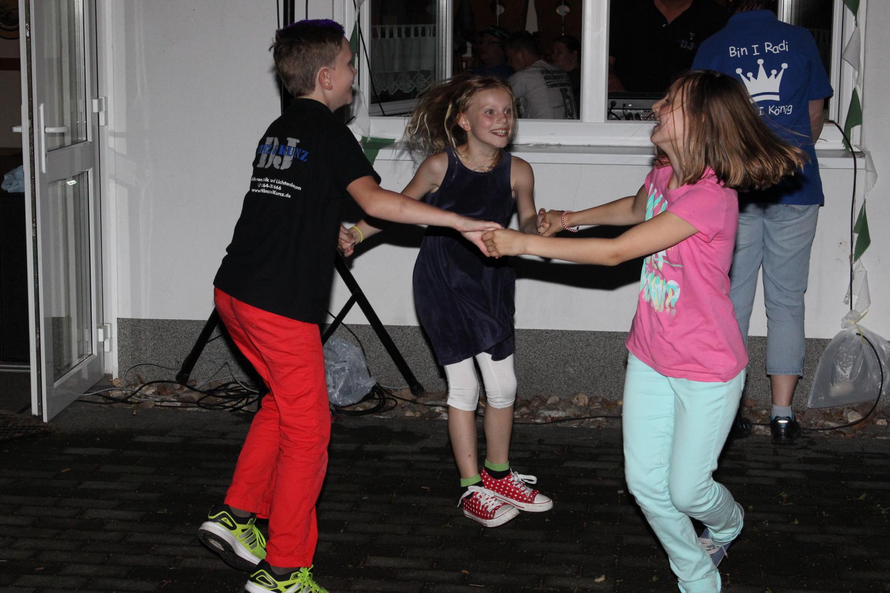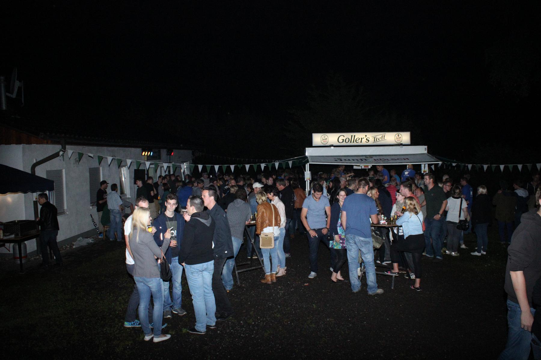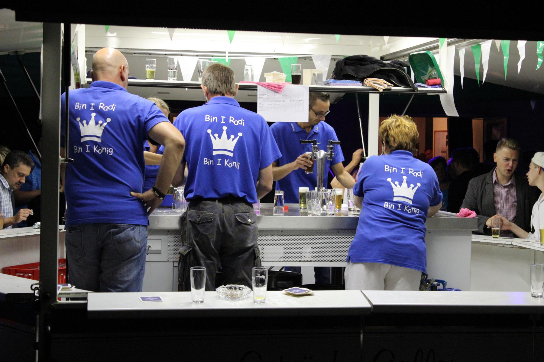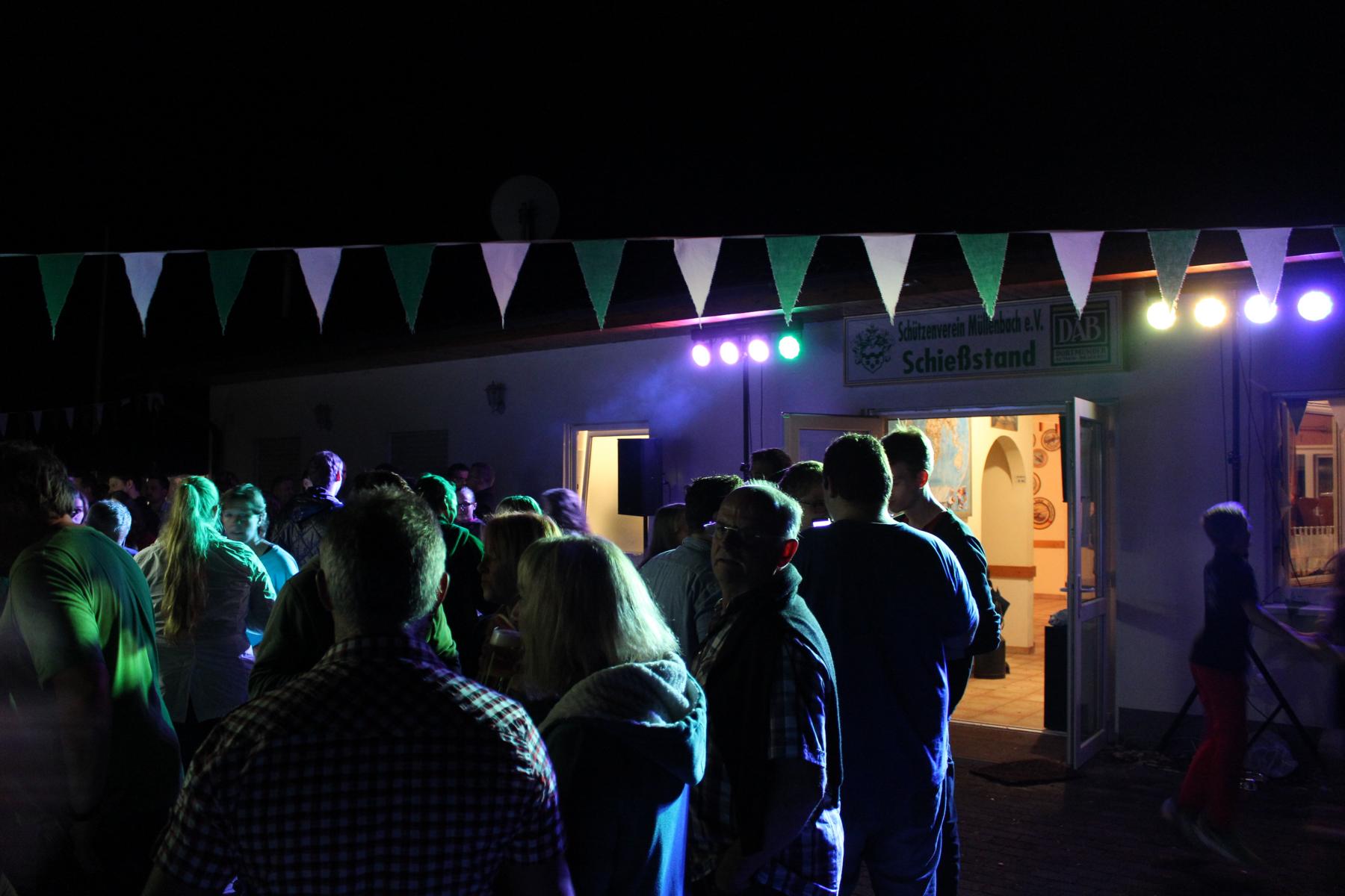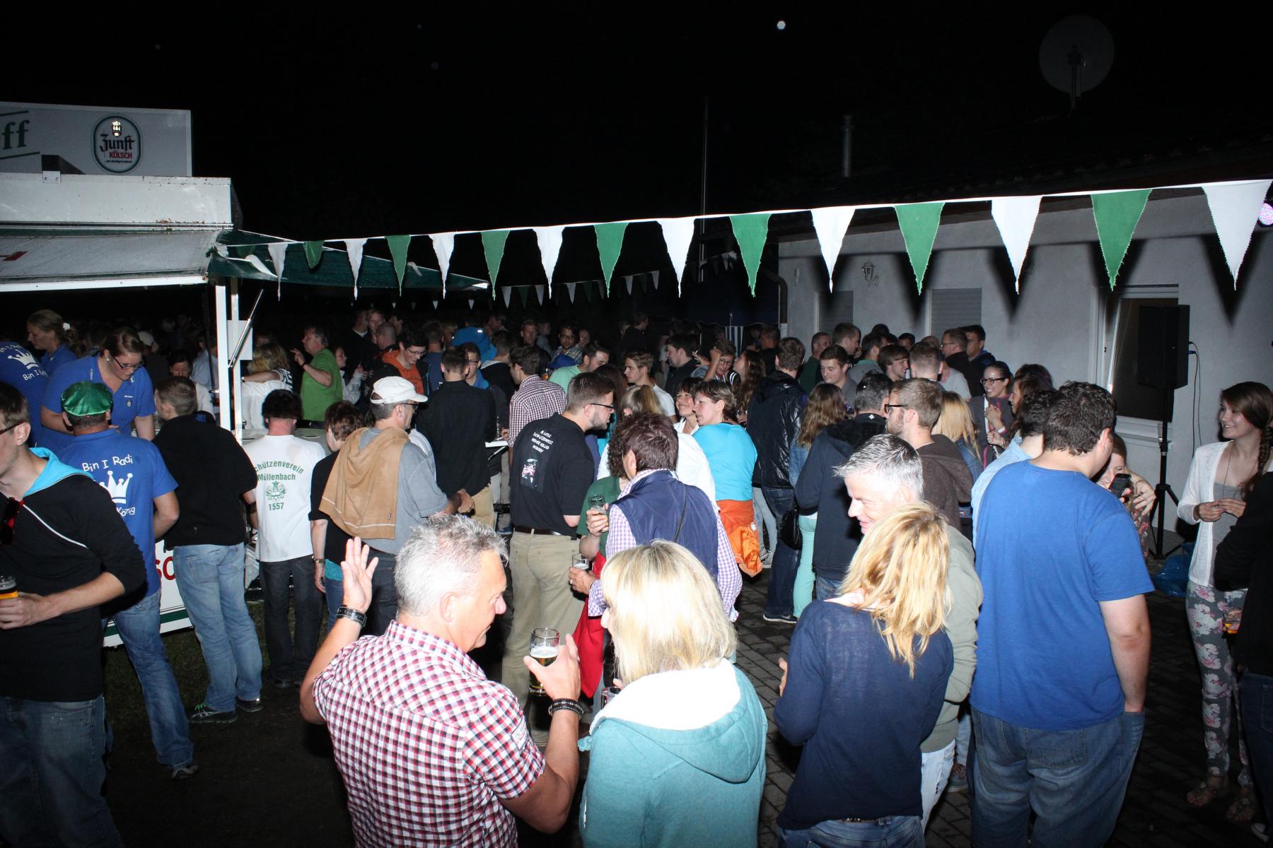 Auf gehts! Es ist Schützenfestzeit in Müllenbach. Bei leicht bewölktem Himmel machten sich am frühen Nachmittag Jung und Alt auf die Beine, um das Dorf in ein grün-weißes Farbenmeer zu verwandeln. Manche akrobatische Übung auf den Leitern zum Befestigen der Wimpelketten hätte zwar bei Wertungsrichtern für gute Haltungsnoten gesorgt – jede Berufsgenossenschaft hätte aber die Hände über den Kopf zusammengeschlagen. Erfreulicherweise sind keine nennenswerten Unfälle bekannt geworden. Die gute Laune und die Vorfreude auf die drei tollen Tage waren in jeder Straße zu spüren. Nach getaner Arbeit versammelten sich die Nachbarn an den jeweiligen Schmückstationen. Alte und neue Kontakte wurde geknüpft oder intensiviert. König Mike Radermacher und Hofmarschall Axel Wernscheid hatten alle Hände voll zu tun und machten sich um fünf Uhr auf den Weg, die 18 Schmückstationen zu besuchen. Strahlend und gut gelaunt wie immer brachten die beiden einen flüssigen Königsgruß für die Erwachsenen vorbei. Für die Kinder hatte sich die Majestät etwas Besonderes einfallen lassen. Ein mit Bildern und Unterschriften des Hofstaates kreierter Eimer voller Süßigkeiten sorgte für Begeisterung. Der gesamte Hofstaat hatte in der Zwischenzeit den Vorplatz des Schießstandes in eine open-air-Arena umgestaltet und hieß die Dorfbewohner herzlich willkommen. Viele machten sich noch spät auf den Weg und die angenehmen Temperaturen sorgten dafür, dass noch zahlreiche Schützen bis weit nach Mitternacht ins Schützenfestwochenende hinein feierten.