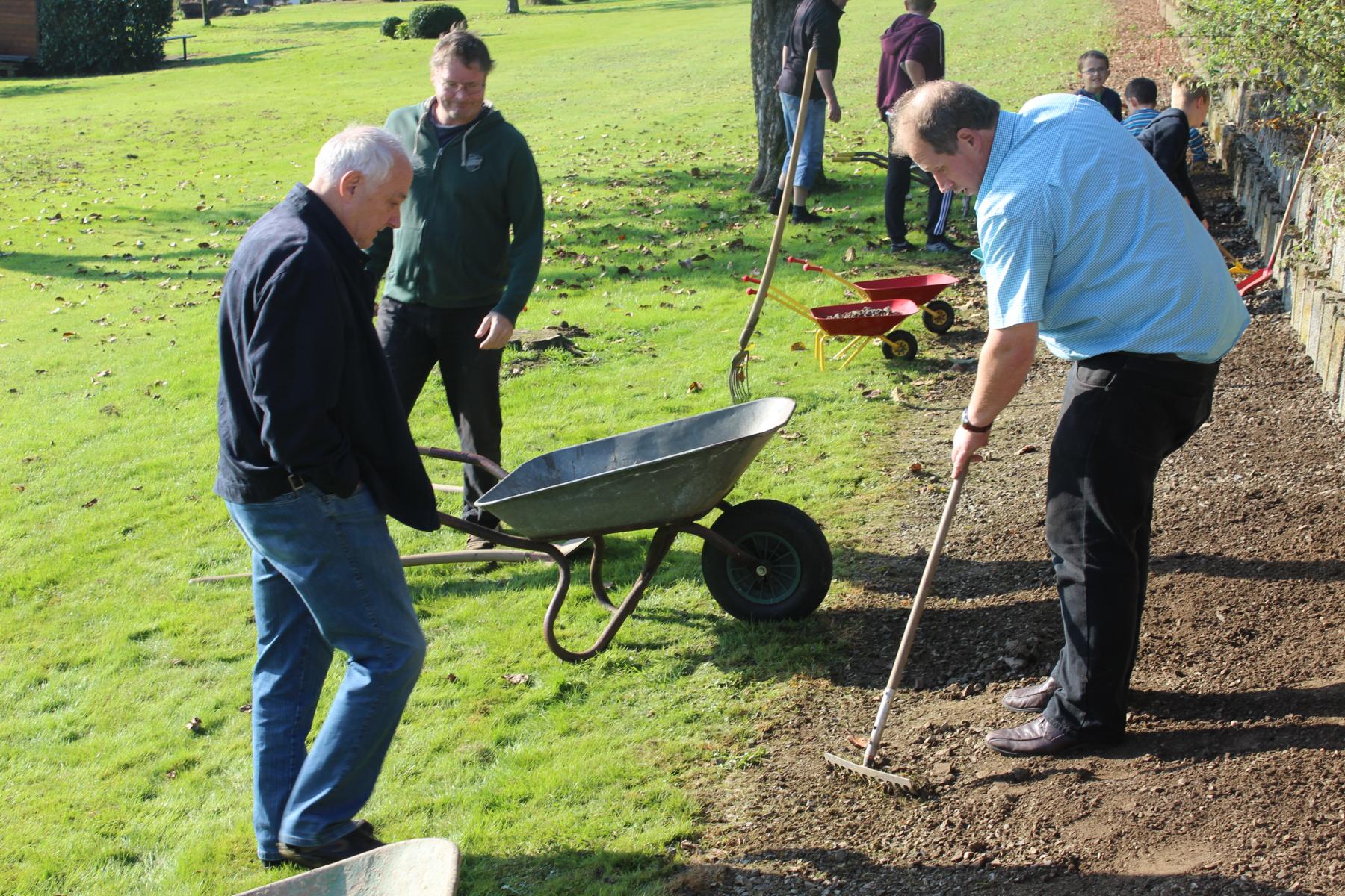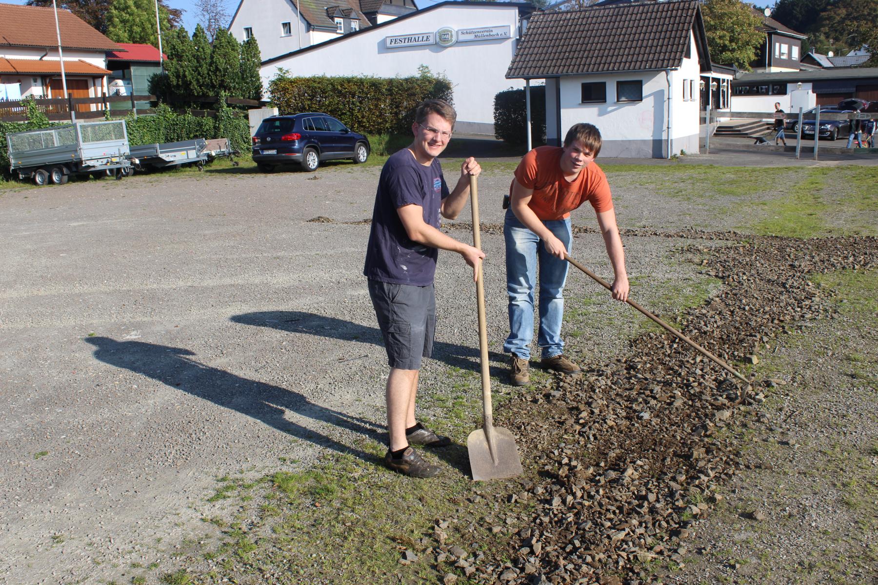 …in und um die Schützenhalle herum. Hallenkommissionsleiter Thorsten Kehlbreier hatte seine Mannschaft zusammen gerufen und sich noch tatkräftige Hilfe vom Hauptvorstand dazu geholt. Dieses Mal standen keine Arbeiten in der Halle auf dem Programm; man(n) nutzte das spätsommerliche Wetter, um das Nachbargrundstück des Festplatzes von Dreck und Steinen zu befreien. In der Vergangenheit hatten Niederschläge und Erdbewegungen dazu geführt, dass Steine und Schotter über die Böschung des Festplatzes auf das unterhalb gelegene Wiesengrundstück gespült wurden. Dieses führte verständlicherweise zu unerwünschten Effekten beim Rasenmähen und so galt es, Abhilfe zu schaffen. Mit tatkräftiger Unterstützung einiger Nachwuchsschützen war die Arbeit schnell erledigt. Zum Abschluss wurde die fein gesäuberte und von Steinen befreite Fläche mit der Rüttelplatte verdichtet und kann nun vom Grundstückseigentümer eingesät werden. Im nächsten Jahr wird dort sicher eine Wiese in sattem Grün erstrahlen und die lästigen Nebengeräusche gehören der Vergangenheit an. Vielen Dank an alle Helfer!