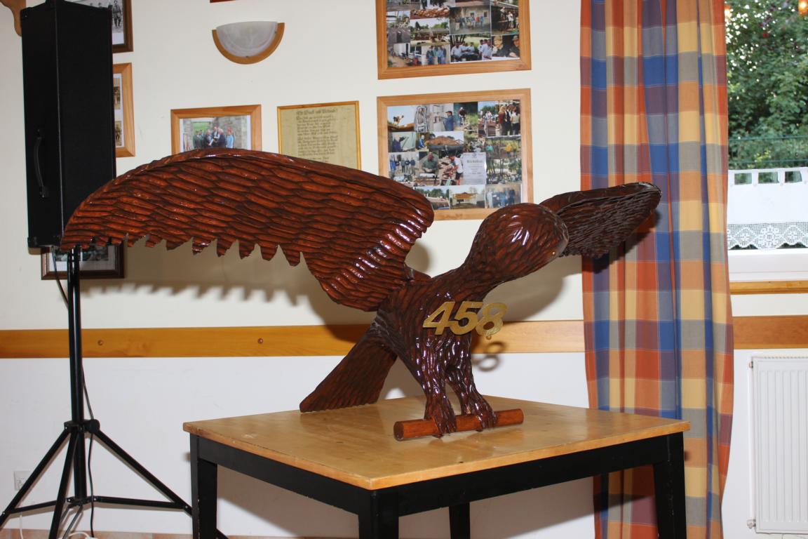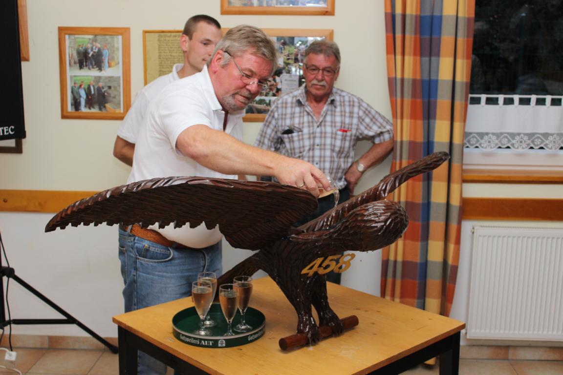 Der Höhepunkt des Abends ließ nun nicht mehr lange auf sich warten. Nach einer kurzen Pause versammelten sich wieder alle Schützen gespannt im Saal und lauschten den Worten von Reiner Schenk. Nach einem kurzen historischen Exkurs auf die Zeit rund um das Jahr 1925 stieg die Spannung spürbar. Fast 60 Stunden Arbeit stecken im Bau des Schützenvogels. Mit rund 12 kg Gewicht ist den Vogelbauern auch in diesem Jahr wieder ein Prachtexemplar gelungen und während seines kurzen Lebens hört der Greif in diesem Jahr auf den Namen: Habicht von der Vogelruthe.