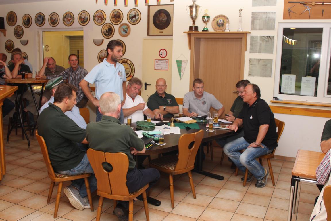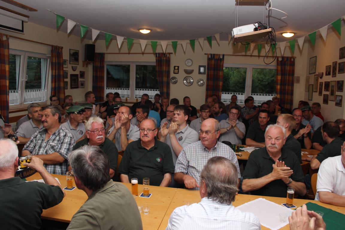 Es ist jedes Jahr wieder erstaunlich, wie viele Schützen sich zur letzten erweiterten Vorstandsitzung vor dem Schützenfest am Schießstand am Brecher treffen. Da gerät der 1. Vorsitzende, Reiner Schenk, immer wieder ins Schwärmen, wenn der ganze Raum bis zum letzten Platz gefüllt ist und in diesem Jahr sogar erstmalig zu wenige Sitzplätze vorhanden waren. Fast 100 Schützen aus allen Kommissionen des Vereins sowie die ehrenamtliche Helfer hatten sich zur Vogeltaufe eingefunden. Nach der Begrüßung hatten zunächst die Kommissionsleiter das Wort und bedankten sich außerordentlich für die geleistete Arbeit im vergangenen Jahr. Axel Wernscheid als Leiter der Schießkommission konnte zunächst vier neue Hospitanten seiner Kommission vorstellen und gab außerdem die erste Hochrechnung des Stoppenschießens bekannt. Bereits 92 Schützen traten am vergangenen Samstag an, um die „Blutdiamanten“ aus dem Kasten zu holen, doch lediglich 45 Schützen kamen mit einem strahlenden Gesicht aus dem Schießbunker. Das macht eine Quote von knapp 49 % und ist auf jeden Fall steigerungsfähig. Einen längeren Redeanteil bekam in diesem Jahr Gert Hevendehl als Leiter der Böllerkommission. Unter den schrecklichen Eindrücken des tragischen Todesfalles Mitte Juli im Sauerland beim Abfeuern der Kanone stellte er klar und deutlich die Bestimmungen und Sicherheitsvorkehrungen für die „Dicke Berta“ dar. Nach den ernsten Worten sorgte Leo Fichna allerdings mit seiner humorvollen Ansprache direkt wieder für gute Laune und sorgte dafür, so dass der Abend weiterhin mit guter Stimmung fortgesetzt wurde.