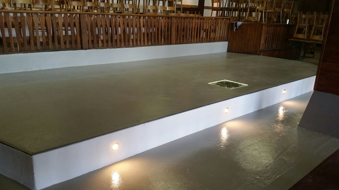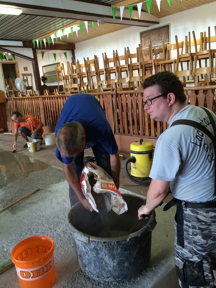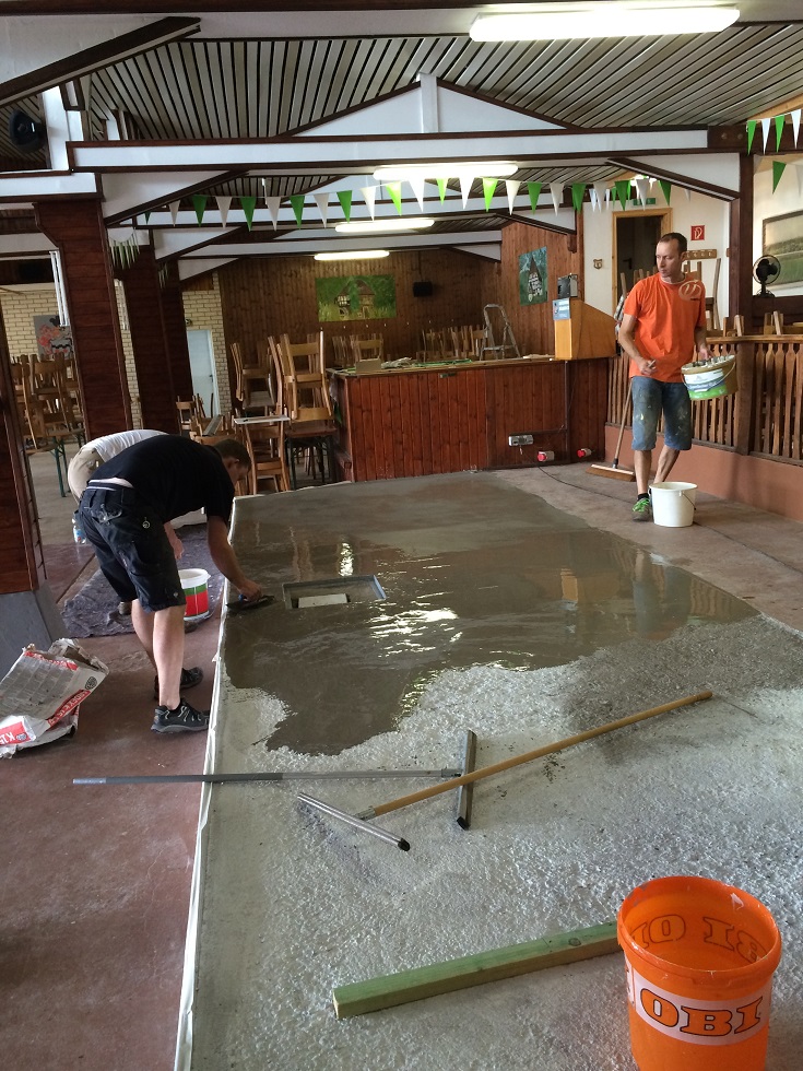 Die Hallenkommission hat in diesem Frühjahr das alte hölzerne Musikpodium abgerissen und durch ein neues ersetzt. Um für die nächsten 100 Jahre gerüstet zu sein, entschied man sich für die Baustoffe Stahl und Beton. Die Mannschaft rund um Torsten Kehlbreier hatte alle Hände voll zu tun, um das Podium technisch und optisch optimal zu gestalten. Da der Estrich beim ersten Versuch nicht erwartungsgemäß abgebunden hatte, war eine Sonderschicht notwendig, um die Oberfläche plan und glatt zu bekommen. Das Endergebnis ist dann aber perfekt: in den Podiumsboden eingelassen ein Vereinswappen und in der Podiumswand auf die Tanzfläche gerichtete Strahler, die an den Ballabenden den Tanzpartys Clubatmosphäre geben werden. Jetzt kann das Schützenfest 2015 kommen. Nicht zu vergessen: bei den Arbeiten wurde mächtig geschwitzt und der Flüssigkeitsverlust musste ausgeglichen werden. Der Nachschub kam per Trecker, die Ladung mustergültig gesichert. Selbst in diesem Bereich erfüllt der Verein nunehr die schärfsten europäischen Auflagen. Na denn, Horrido!