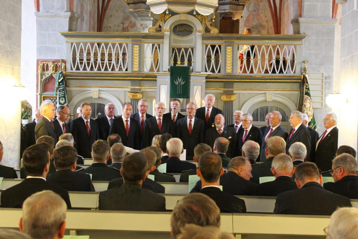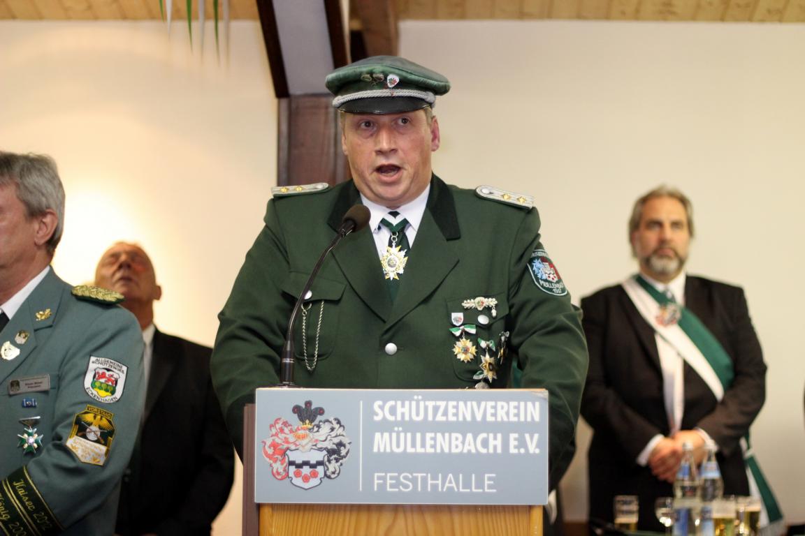 Damit hatte niemand gerechnet: Orkanböen und Starkregen verhinderten das traditionelle Platzkonzert als Auftakt zum 458. Schützenfest in Müllenbach. Der Vorstand sagte den Umzug zu Beginn der Feierlichkeiten ab. Allerdings trotze die dicke Berta den widrigen Wetterverhältnissen und eröffnete programmgemäß das Fest um 18.00 Uhr. Die Schützen holten die Fahnen ohne Kapelle in der Dorfmitte ab und marschierten auf direktem Wege zum Festgottesdienst der besonderen Art. Pfarrer Pietschmann, der am Ende dieses Jahres in den Ruhestand tritt, verabschiedete sich mit einem sehr persönlichen uns eindrucksvollen Gottesdienst, der vom MGV Müllenbach, unter der Leitung von Petra Meister, mitgestaltet wurde. Rückblickend auf die vergangenen 30 Jahre gab er einige Episoden in humorvoller aber nachdenklicher Weise zum Besten. Nach dem Gottesdienst erwarteten die Musiker des Musikvereins Hoffnung Hünsborn die Schützen und führten den Zug zur Abholung der Marienheider Majestäten und deren Hofstaaten in die Festhalle.