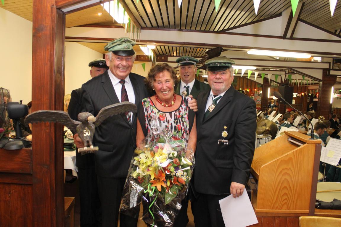 Eine besondere Ehrung erfuhren Edgar und Martha Berges: Edgar wurde für seine 50-jährige Vereinstreue ausgezeichnet und zusammen mit seiner Frau feiert er gleichzeitig sein 50-jähriges Königsjubiläum. Zu diesem Anlass überreichte der Verein eine kleine Variante des Müllenbacher Schützenvogels.