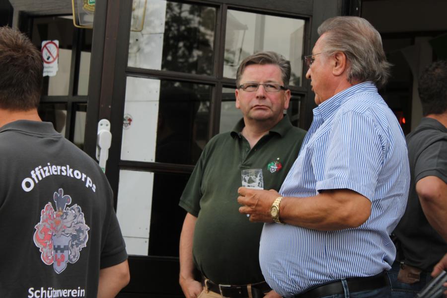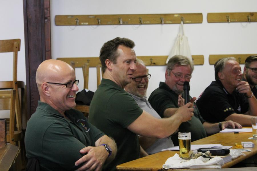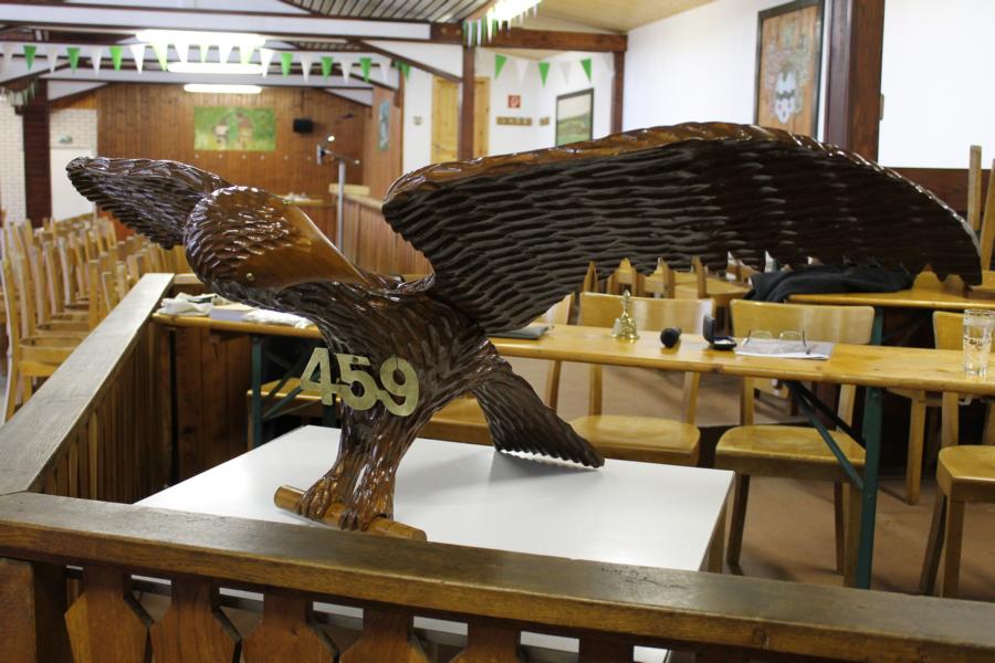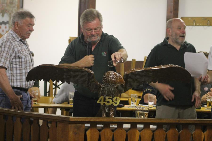 Wie in jedem Jahr strömten am Donnerstag vor dem alljährlichen Schützenfest die Aktiven der jeweiligen Kommissionen zur Vogeltaufe. Da im letzen Jahr nicht genügend Platz für alle Schützen im Schießstand am Brecher vorhanden war, fand in diesem Jahr die Vogeltaufe in der Schützenhalle statt. Knapp 90 Schützen ließen sich diese Gelegenheit nicht entgehen, den Dank des Vorstandes für die geleistete Arbeit in den letzten 52 Wochen entgegen zu nehmen. Nachdem alle Kommissionsvorsitzenden über den aktuellen Stand der Vorbereitungen berichtet hatten und eine wohlverdiente Pause eingeschoben wurde, begann der 1. Vorsitzende Reiner Schenk mit der Taufzeremonie. Wohl kaum ein Lebewesen in Müllenbach hat so wenig Probleme mit seiner Figur. Er (oder sie) hält ihr Gewicht seit Jahren und geht auch nicht in die Breite. Mit den Modelmassen von rund 140 cm Spannweite und einem Rumpf von ca. 90 cm bei einem Gewicht von 12 kg ist der Königsvogel von Müllenbach der Inbegriff von Konstanz. Auch in diesem Jahr erstrahlte der hölzerne Greif von der Empore und alle warteten auf seinen Namen. Nach einem Rückblick auf die Geschehnisse rund um die Schützenfeste der Jahre 1926 und 1966 trat Reiner Schenk in Aktion und gab dem diesjährigen Vogel seinen Namen. Es gilt nun, am Sonntag den Rotmilan vom Engelberg zu erlegen und damit neuer Schützenkönig von Müllenbach zu werden. Allen Aspiranten wünschen wir an dieser Stelle viel Erfolg. Horrido.