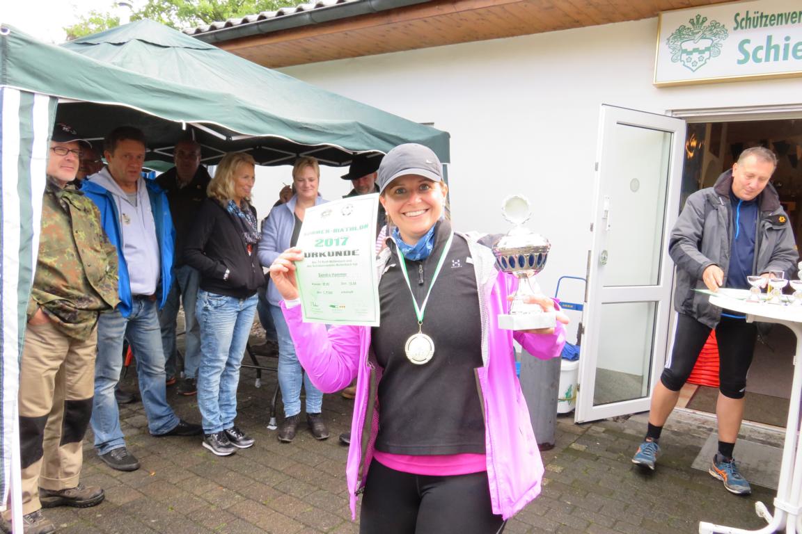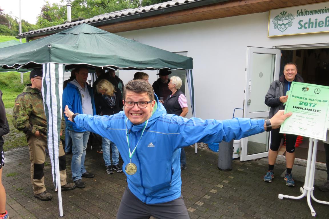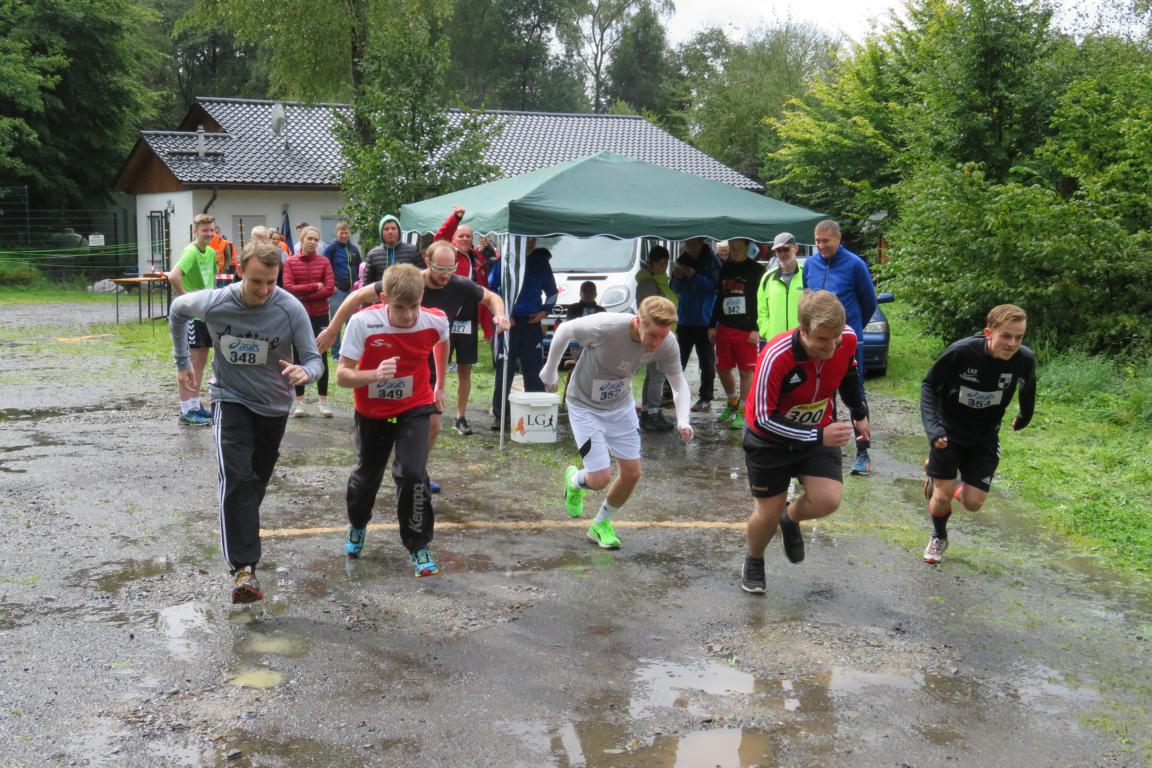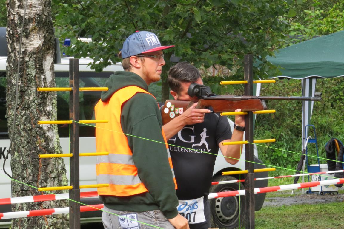 Bereits zum neunten Mal organisierten der TV Rodt-Müllenbach und der Müllenbacher Schützenverein den alljährlichen Sommerbiathlon rund um den Schießstand „Am Brecher“. In diesem Jahr wurde die Veranstaltung aber nur in Teilen seinem Namen gerecht. Dichte Bewölkung und niedrige Temperaturen ließen eher auf einen „Herbst-Biathlon“ schließen. Knapp 30 Aktive trotzen aber den widrigen Bedingungen und sorgen dafür, dass alle einen Nachmittag mit gesundem Ehrgeiz, viel Spaß und gegenseitigem Respekt erlebt haben. Der Wettkampf startete mit den Nachwuchsschützen und –sportlern in der Wettkampfgruppe „Männliche Jugend B und Jugend A. Ihnen folgte die erste Gruppe „M20“, die im Wesentlichen aus Handballern der ersten Mannschaft vom SSV Marienheide bestand, und die Veranstaltung als kleine Trainingseinheit für die Saisonvorbereitung genutzt haben. Nun folgte leider die erste Unterbrechung aufgrund des immer stärker werdenden Regens. Über eine halbe Stunde mussten die Läufer auf den Startschuss für nächste Runde warten. Zwischenzeitlich war der Regen so stark, dass es sogar Befürchtungen gab, dass die Veranstaltung im wahrsten Sinne des Wortes ins Wasser fallen würde. Die Ruhe und Geduld der Verantwortlichen wurden aber belohnt und die nächsten Gruppen konnten den Wettkampf fortsetzen. Unbeeindruckt von der Unterbrechung ging nun der spätere Tagessieger 2017 an den Start. Mit einem Streckenrekord von 10:48 Min sorgte Laurin Schenk für die diesjährige Topleistung, die mit gebührendem Applaus honoriert wurde. Auf den weiteren Plätzen folgten Philipe Ginczek (11:58) vor Maximilian Schaaf (11:59).
