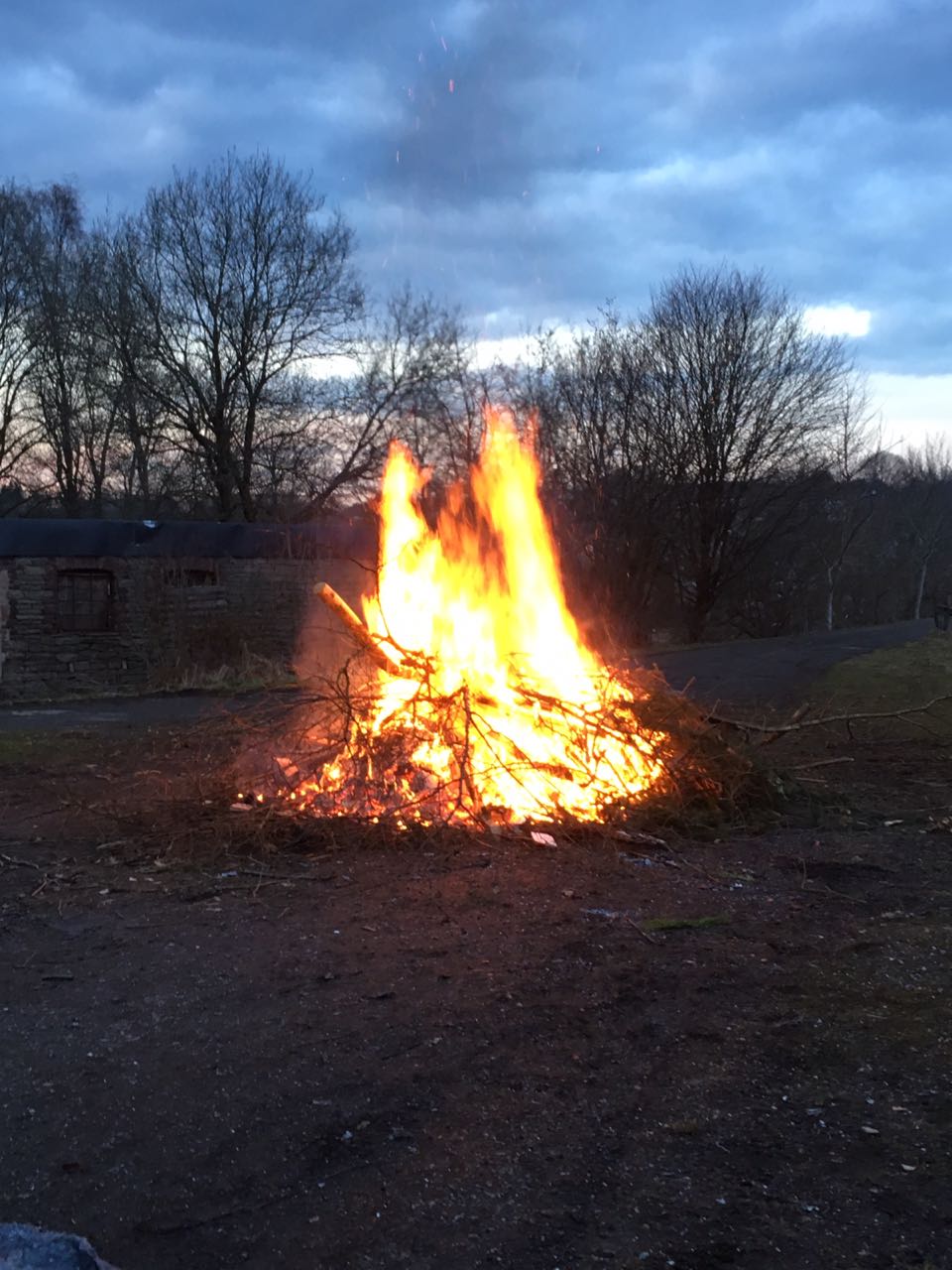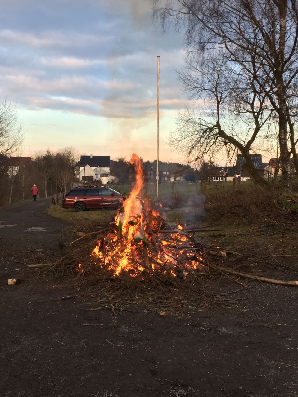 Die Schießkommission und König Dennis mit seinen Hofdamen und –herren hatten dieses Event spontan organisiert, waren doch bei den winterlichen Freischneideaktionen an der Schützenhalle und am Schießstand erhebliche Mengen an Brennmaterial zusammengekommen, die in geselliger Runde gut „warm entsorgt“ werden konnten. Ordnungsgemäß wurde das Feuer bei der Gemeindeverwaltung angemeldet. So kam es dann, dass der Bürgermeister, Stefan Meisenberg, auf seiner Osterfeuer-Rundreise in Begleitung des neuen zuständigen Mitarbeiters des Ordnungsamtes in Müllenbach vorbeischaute und sich über das Engagement des Schützenvereins für die Dorfgemeinschaft freute.