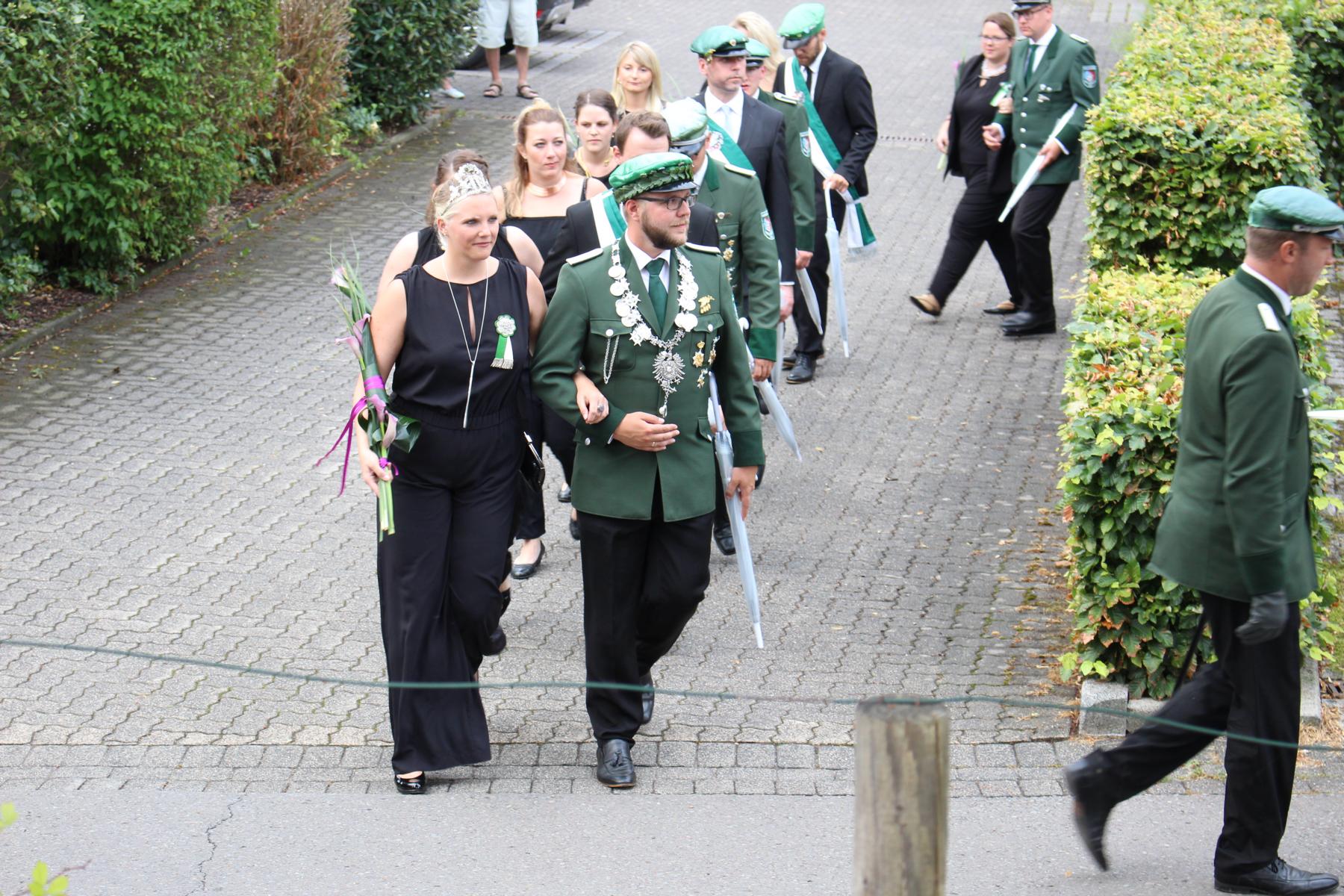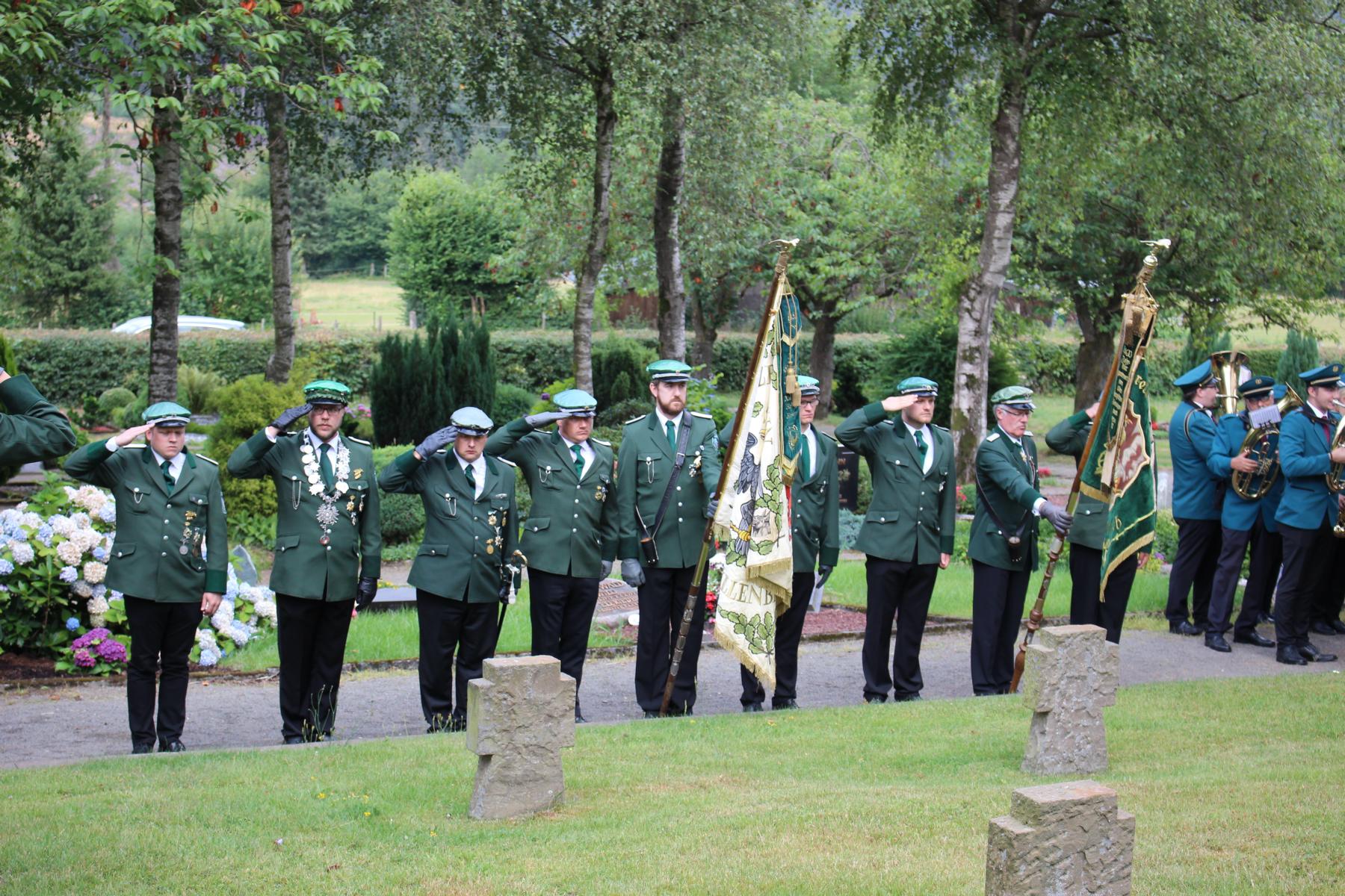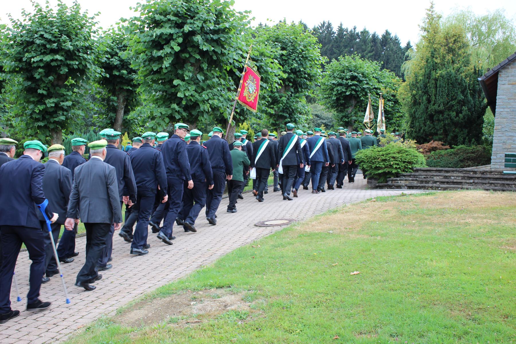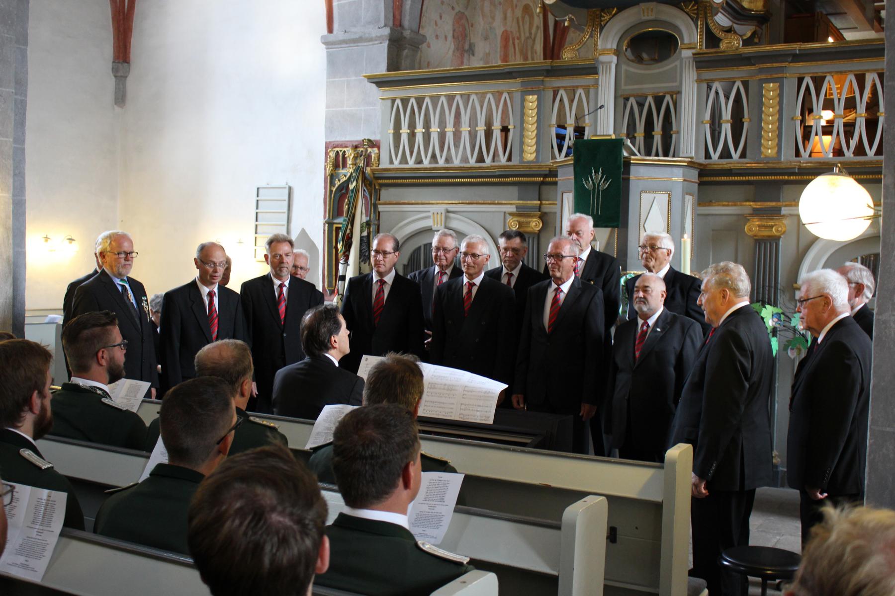 Über 100 Schützen traten nun an, um kurz danach dem Kommando „rechts um“ zu folgen und sich in Richtung Friedhof zur Kranzniederlegung in Bewegung zu setzen. Kurz vor halb sieben erwarteten Sonja Denke in Vertretung für Kai Berger und Elke Bosch die Männer zum Schützengottesdienst. Die dicken Mauern der Wehrkirche sorgten dafür, dass die schwülen Temperaturen draußen blieben und jeder ein wenig abkühlen konnte. Der MGV Müllenbach unter der Leitung von Ralf Zimmermann sorgte mit seinen Liedern für einen festlichen Rahmen des Kirchenbesuchs.