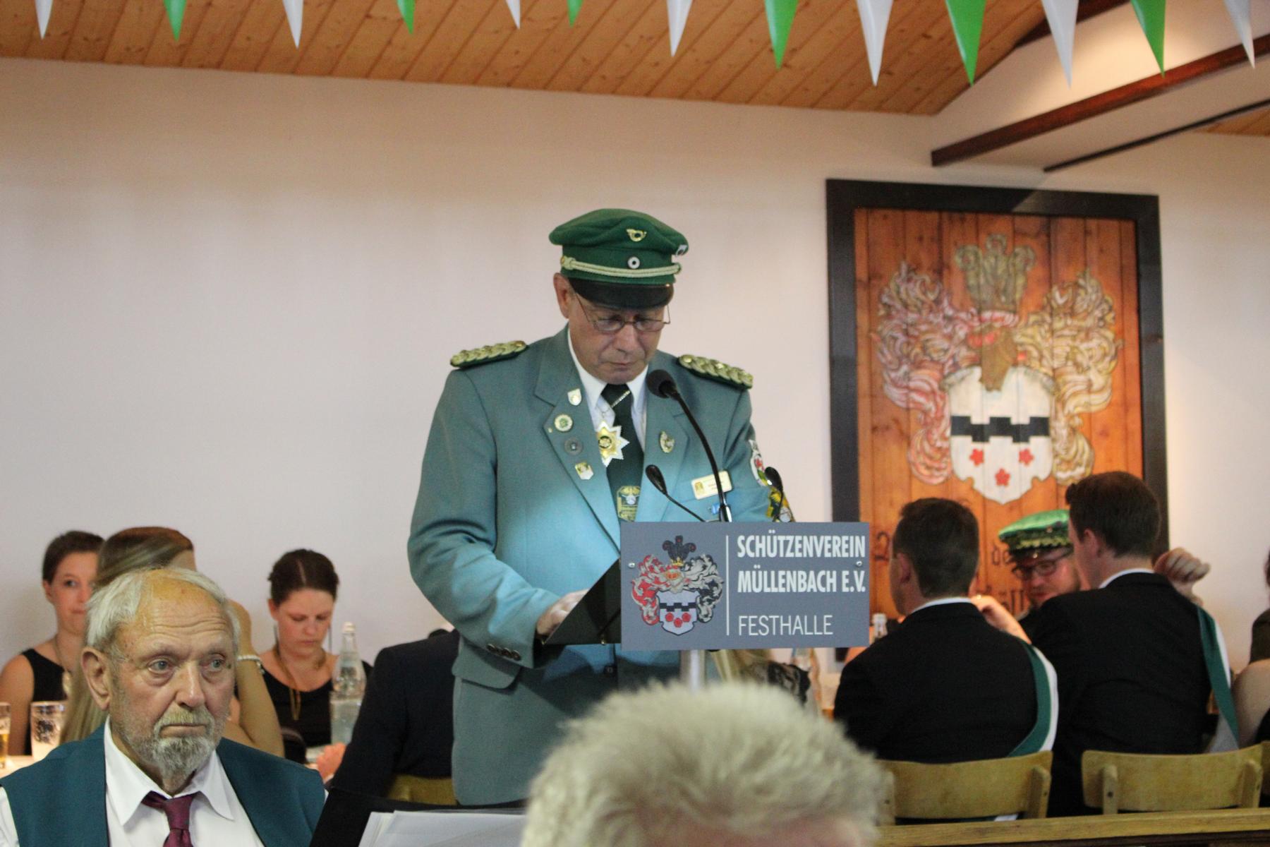 Reiner Schenk dankte allen aktiven Schützenbrüdern, die mit ihrem Fleiß und Engagement dieses Fest möglich gemacht haben. Die in diesen Tagen in der Presse thematisierten Probleme vieler oberbergischer Schützenvereine mit dem Schießwesen sind auch in Müllenbach bekannt. In der Ansprache des Vorsitzenden des OSB, Klaus Büser, wurden diese Probleme ebenfalls mit scharfen Worten kommentiert. Das hinderte ihn jedoch nicht, die Leistungen des langjährigen ersten Vorsitzenden Reiner Schenk zu würdigen, und ihm die Präsidentennadel des OSB zu verleihen.