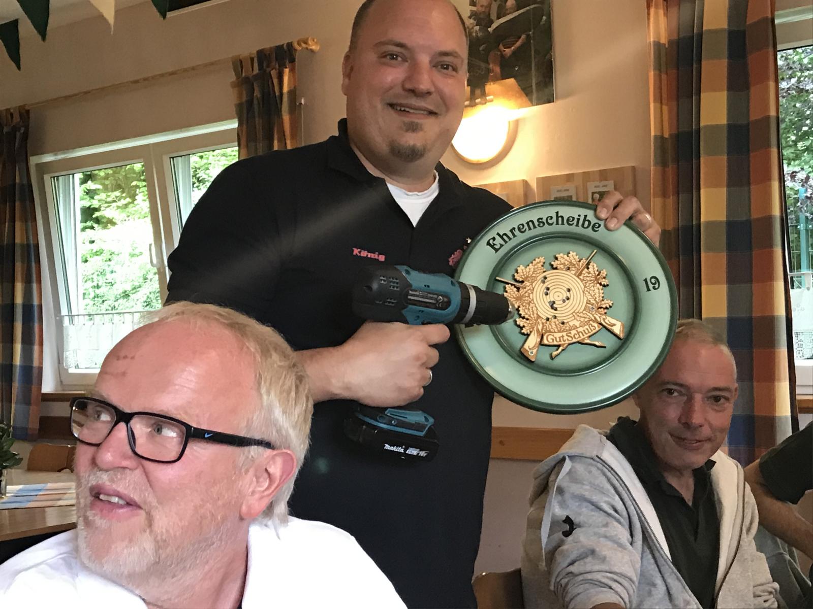 Seine Majestät Sascha I. hatte eine Ehrenscheibe gestiftet, die unter den Königsveteranen ebenfalls ausgeschossen wurde. Wiederum qualifizierte sich Dirk Schenk für den dritten Platz, Kalle Linde für den zweiten und Udo Hermann konnte sich als Sieger behaupten. Die Zeit verging bei einigen Bierchen, Kaffee, Waffeln und deftigem vom Grill im Flug. Bei schönem Sommerwetter genossen die Teilnehmer den Tag in der Sonne, während die Kinder sich auf der Hüpfburg vergnügten und ihr Fußballtalent an der Torwand erprobten. Für die kommenden Sonntage hängt die Latte bereits jetzt schon hoch: mehr als ein Schütze schoss 30 Ringe. Aber auch ohne ein Bestergebnis macht es Spaß, den Sonntag am Schießstand zu verbringen.