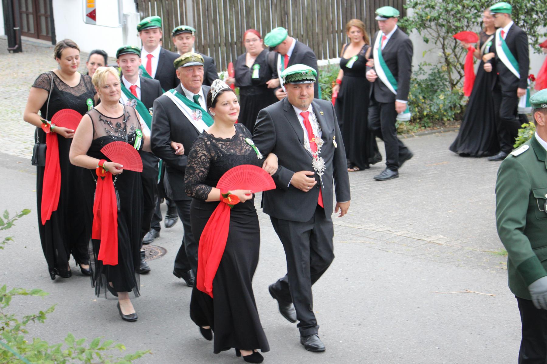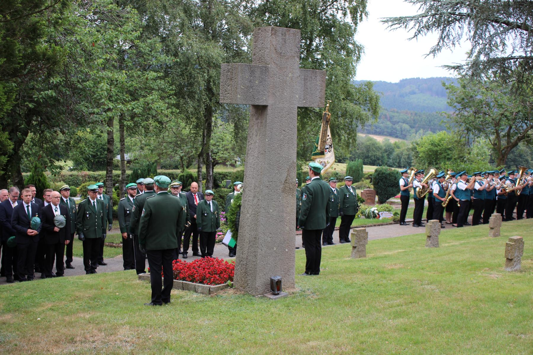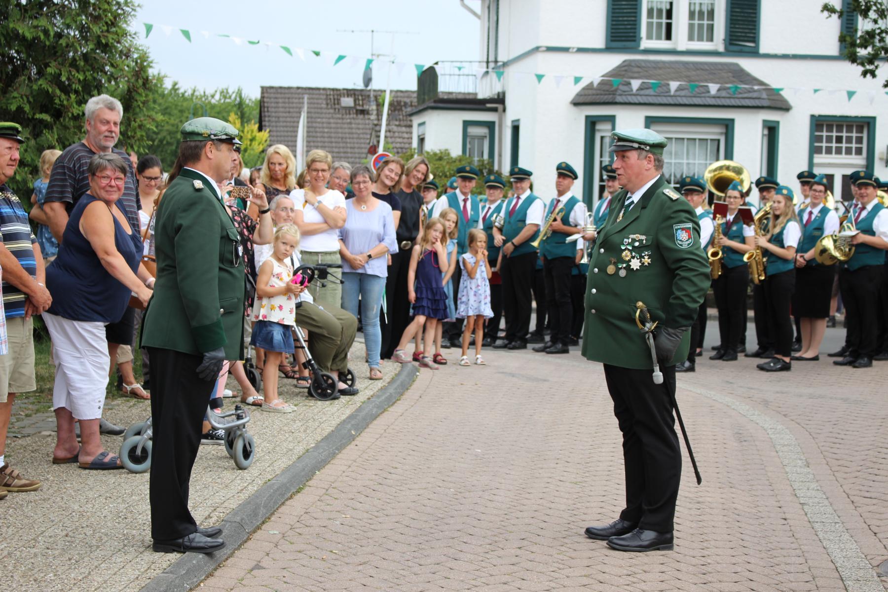 Traditionell wurde das alljährliche Schützenfest mit den Klängen des Musikvereins „Hoffnung Hünsborn“ eingeläutet. Ab 17 Uhr fand das Platzkonzert an der Friedenseiche statt, zu dem zahlreiche Zuschauer und Zuhörer bei halbwegs erträglichen Temperaturen in die Dorfmitte kamen. Punkt 18 Uhr verschaffte sich die „Dicke Bertha“ mit fünf markerschütternden Böllerschüssen die gebührende Aufmerksamkeit und gab somit das Zeichen zum Antreten der Schützen. Nach dem Abholen der Fahnen marschierten die knapp 100 Schützen zum Ehrenfriedhof und legten dort den Kranz nieder. Die etwas kühleren Gemäuer der alten Wehrkirche nutzen viele Schützen zum Ausruhen und Verschnaufen, während Elke Bosch mit der Unterstützung und der musikalischen Begleitung des MGV Müllenbach unter dem Dirigat von Ralf Zimmermann einen stimmungs- und humorvollen Gottesdienst feierte. Dabei schob sie den Generationswechsel im Schützenverein in den Mittelpunkt ihrer Predigt unter dem Gedanken: „Meine Zeit seht in deinen Händen“ – ein allseits bekanntes Zitat aus Psalm 31.