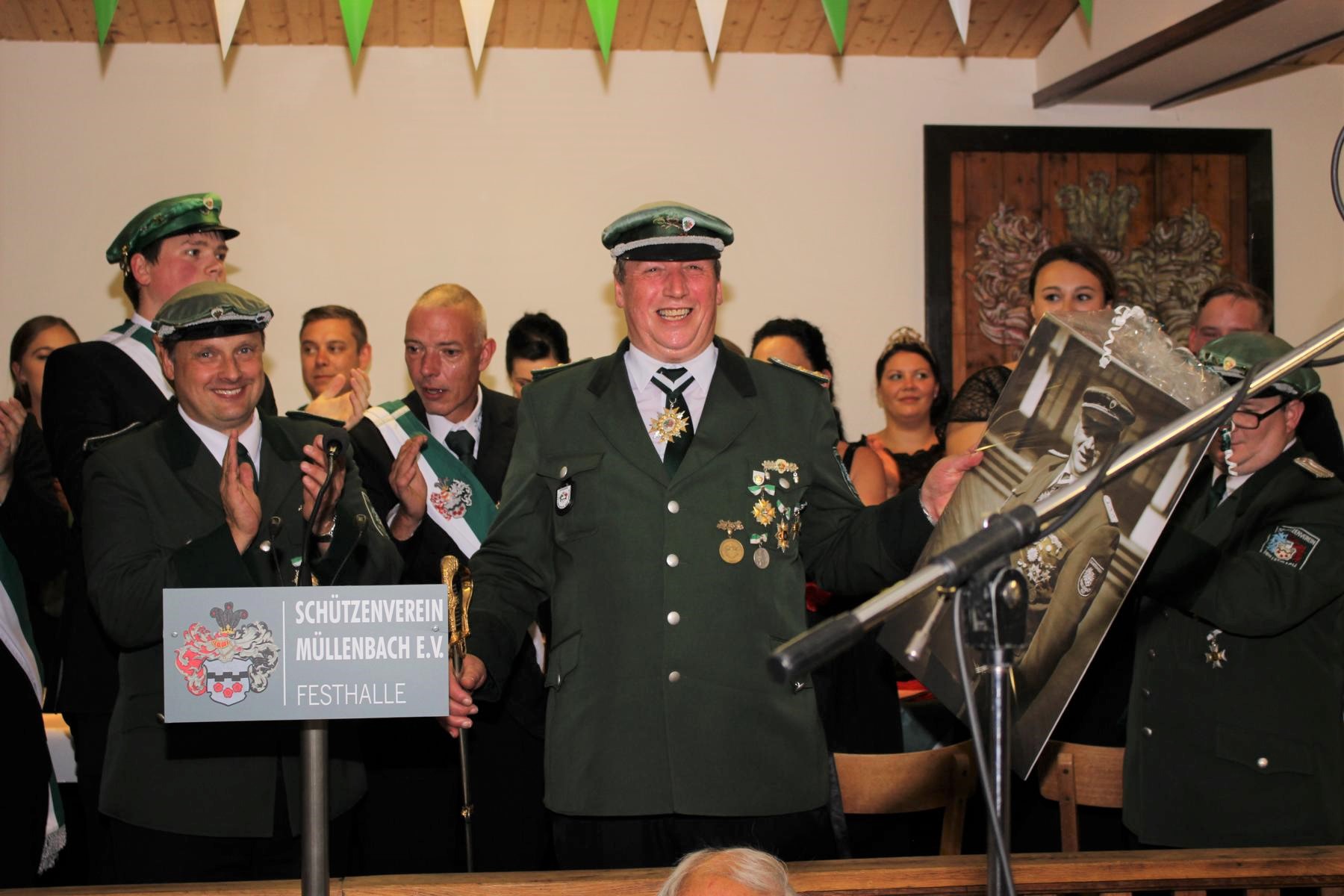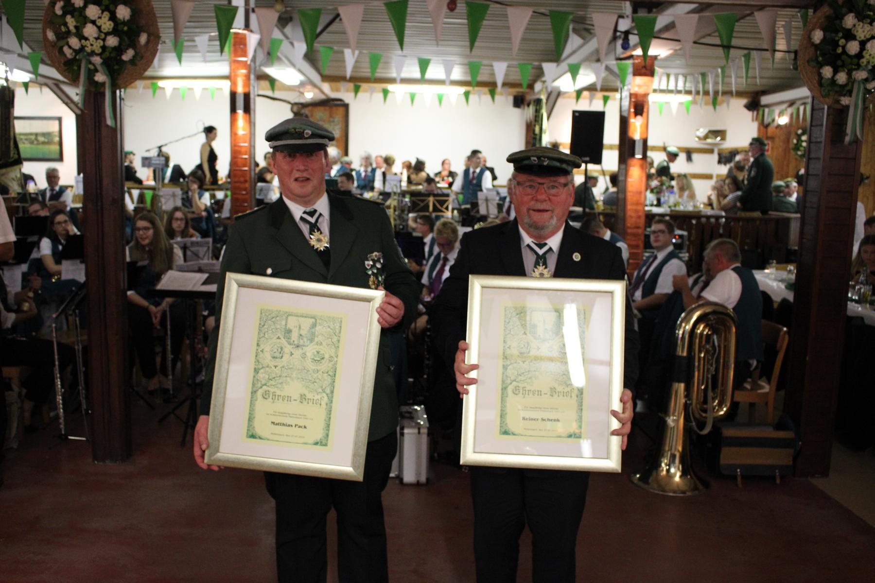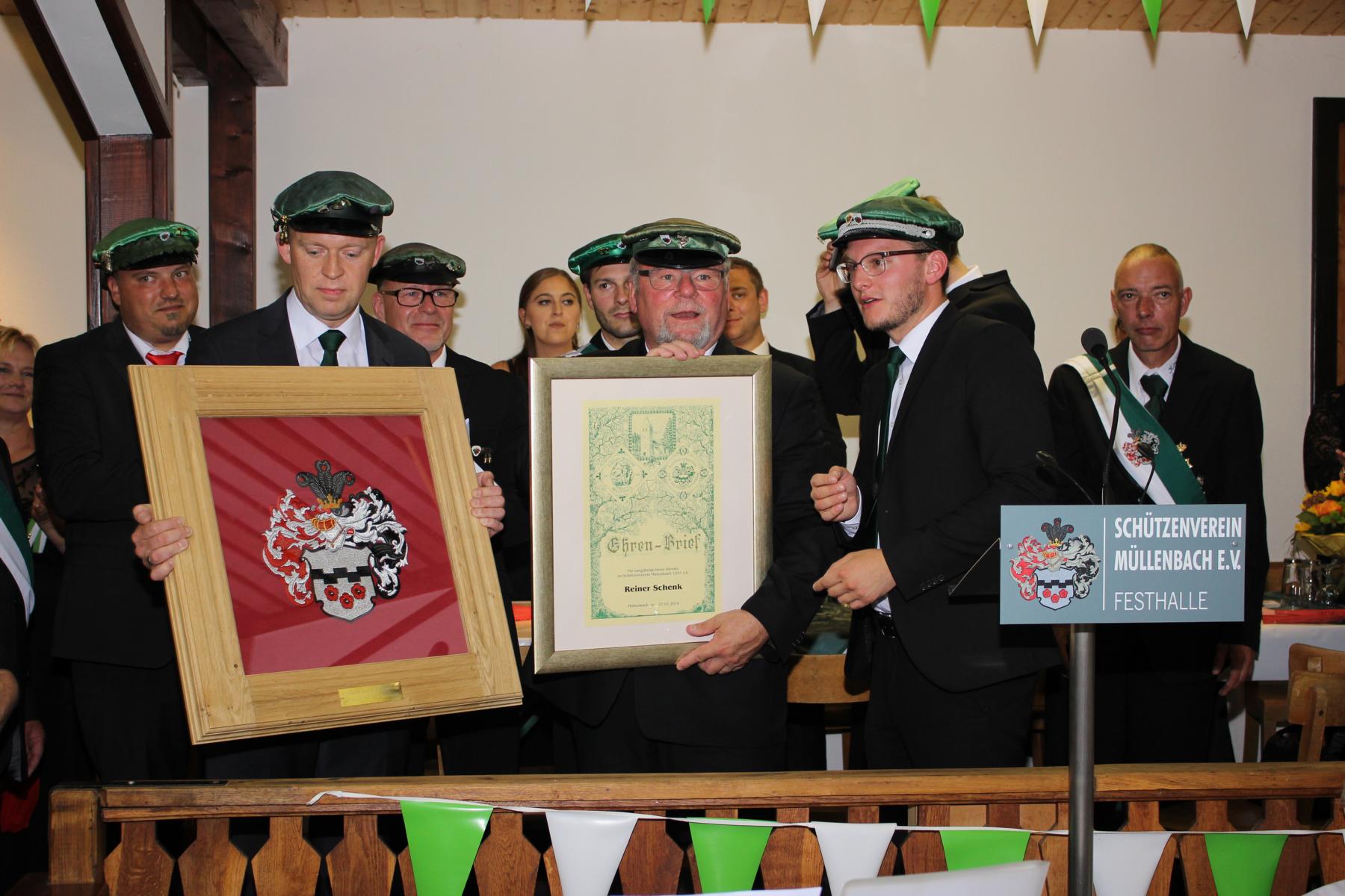 Matthias Pack, der weit über die Grenzen von Müllenbach hinweg bekannte Hauptmann und langjährige 2. Vorsitzende, hatte ebenfalls bei der Generalversammlung sein Amt abgegeben und wurde anschließend einstimmig zum Ehrenhauptmann ernannt. Auch er wurde mit dem Ehrenbrief ausgezeichnet. Sein Nachfolger Thomas Schenk blickte in seiner Laudatio auf die langjährige, erfolgreiche Arbeit zurück, die sie größtenteils gemeinsam erlebten.