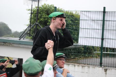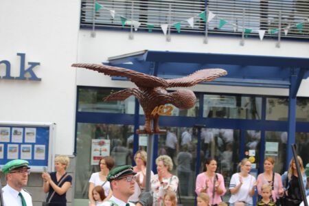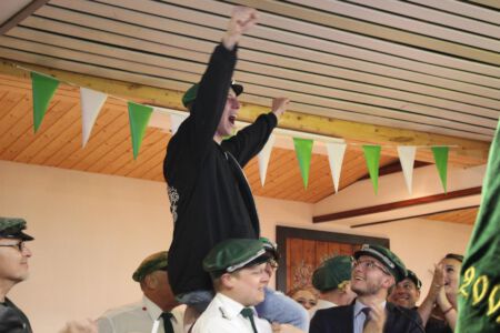 Fynn Samen, Julian Schenk, Felix Niehaus und Robin Schenk zeigten Nervenstärke, auch wenn der Vogel sich kaum beeindruckt vom zielsicheren Beschuss zeigte. Der im Laufe des Nachmittags einsetzende Nieselregen kühlte nach den letzten heißen Tagen die Gemüter, doch zerrte der Verlauf des Schießens Schützen und auch den Zuschauern gehörig an den Nerven. Der erste Vorsitzende Carl-Christoph Pietschmann kündigte dann auch gegen 18:30 Uhr die Verschiebung des gesamten Programmablaufs an: Die Macht des Faktischen ist eben alternativlos.