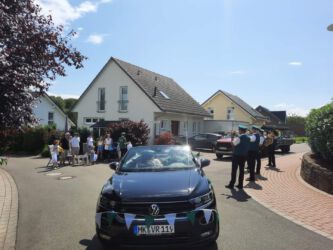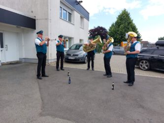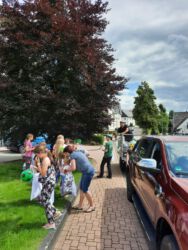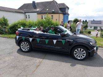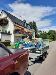 Wie im vergangenen Jahr konnten sich die Kinder bei der Kinderfestkommission anmelden, um an der Kinderbelustigung teilzunehmen. Das Team um Kommissionsleiter Thorsten Klein hatte wieder über 100 Taschen gepackt und die Geschenke im Kirchspiel Müllenbach verteilt. Angeführt von Kinderkönig Louis Ramser und Kinderkönigin Chiara Eck und der musikalischen Begleitung von fünf Bläsern des Musikvereins „Hoffnung“ Hünsborn wurde am Feuerwehrgerätehaus in Müllenbach gestartet. Die Kinder warteten gebannt an der Straße, um zu schauen, wann der Treck mit dem Anhänger in ihre Straße einbiegt. Mit großer Freude und strahlenden Gesichtern wurden die Geschenke in Empfang genommen, und die anwesenden Eltern freuten sich gleich mit – bekamen sie doch zusätzlich ein Ständchen gebracht. Einem Mädchen wurde auf der Tour eine besondere Aufmerksamkeit zuteil. Isabel Achenbach nahm als 100. Kind an der 2. Schützenverein-Müllenbach-Alternativ-Kinderbelustigung teil und bekam als Erinnerung zusätzlich eine Urkunde überreicht.