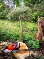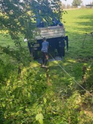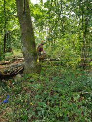 Auf Grund der Unwegsamkeit des Geländes und der aufstehenden Baumstärken waren für diese Durchforstung Fachwissen, Erfahrung und schweres Gerät notwendig. Die beiden Schützenbrüder Florian Schenk und Sebastian Viebahn haben mit ihrer Firma Kappmannschaft GbR die Arbeiten in Angriff genommen und erfolgreich beendet. Als größte Herausforderung stellte sich dabei das zielgenaue Fällen eines 27 Meter langen Baums heraus. Ein besonderer Dank gilt Willi Schorre, der das Überfahren seiner Weide trotz nassen Wetters gestatte und somit die Aktion erst möglich machte.