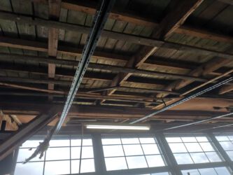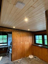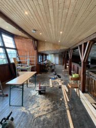 - Auf der Empore wurde die Kunststoff-Deckenverkleidung demontiert und durch Holzpanelen ersetzt. In den 80 m2 Deckenfläche sorgen Einbaustrahler für die entsprechende Beleuchtung. Die Stützpfeiler werden von ihrer Verkleidung befreit und rustikal aufgearbeitet. Die Empore hat damit die Atmosphäre einer gemütlichen rustikalen Almhütte.